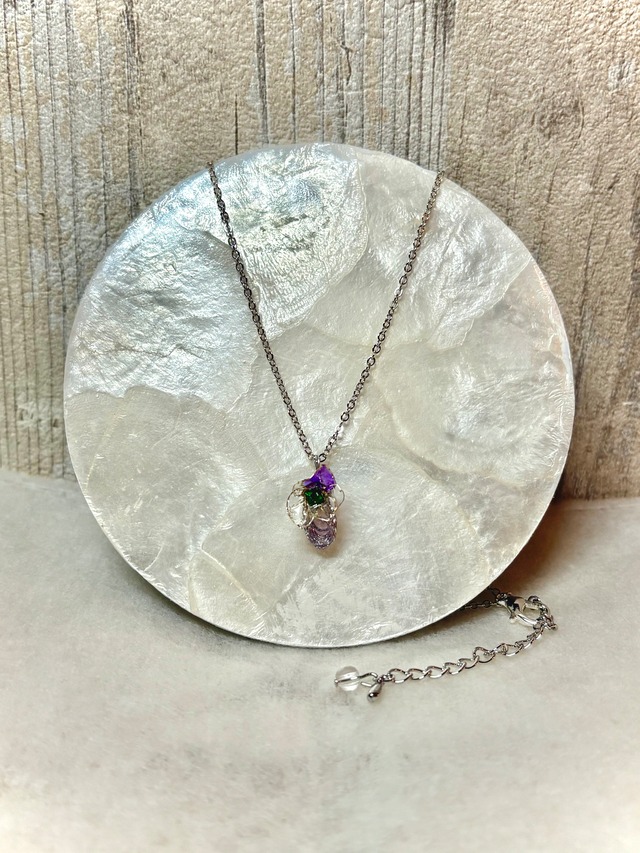 石の奇跡「宝石に花が咲きました」 アメジスト 浄化、癒し、洞察力、インスピレーション、ストレス暖和 心身を癒し、ストレスや緊張を緩和する効果があると言われています。 また、睡眠の質を向上させる、インスピレーションや洞察力を高める、ネガティブなエネルギーを浄化する、愛情や平和を育むなどの効果があるとされています。 一つとして同じものはなく、世界に一つだけのネックレスです。 チェーンの長さ、38cm+アジャスター ¥3500(3850) 送料無料 1点のみです ※環境や、光の加減により、写真と実物の色合いが異なる場合があります。 ※天然石は一点物で、インクルージョンがあります。 ※アクセサリーはデリケートです。 パーツや金具等に無理な力がかかると変形する場合がありますので、優しくお取り扱い下さい。 ※マルシェや他でも販売致しますので、タイミングにより、在庫切れの場合がございます。 ご理解の程宜しくお願い致します。