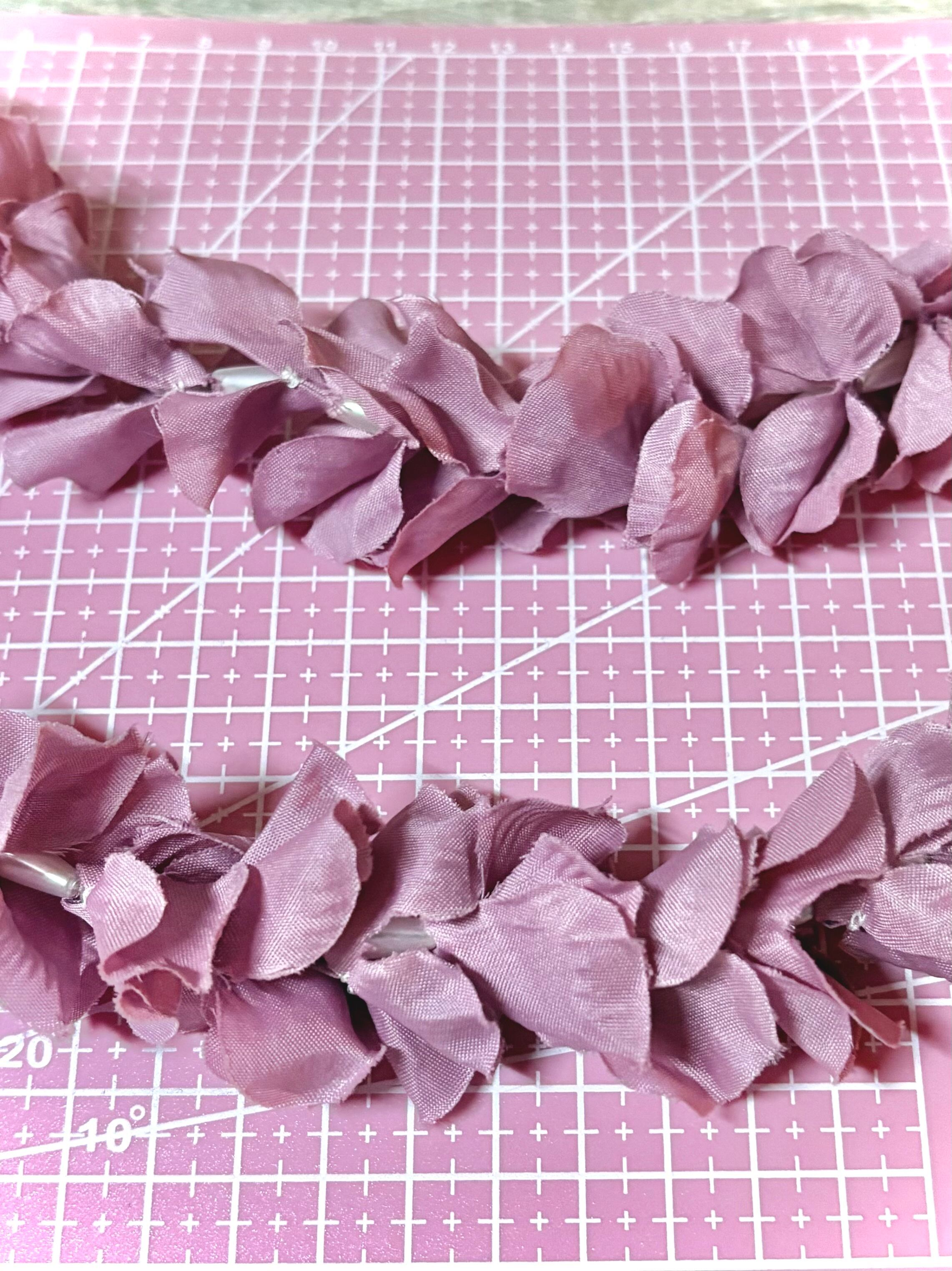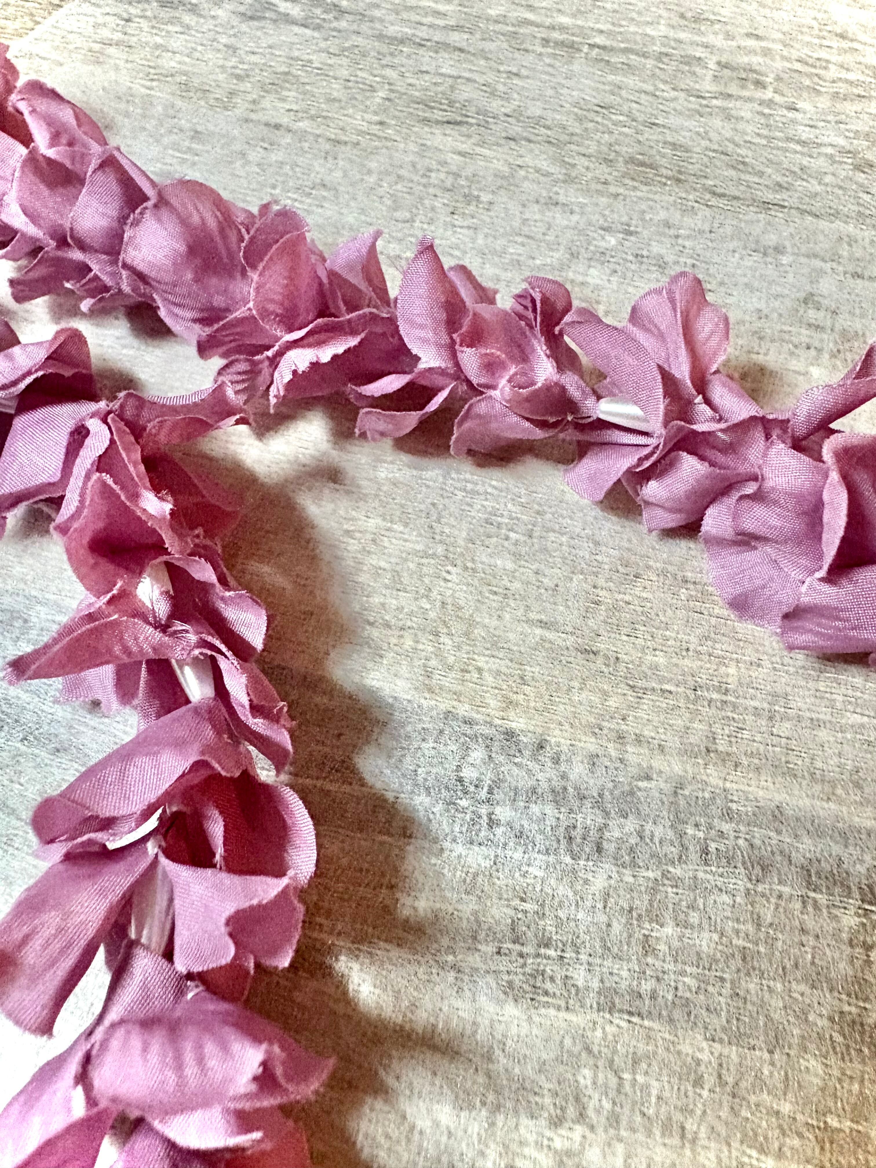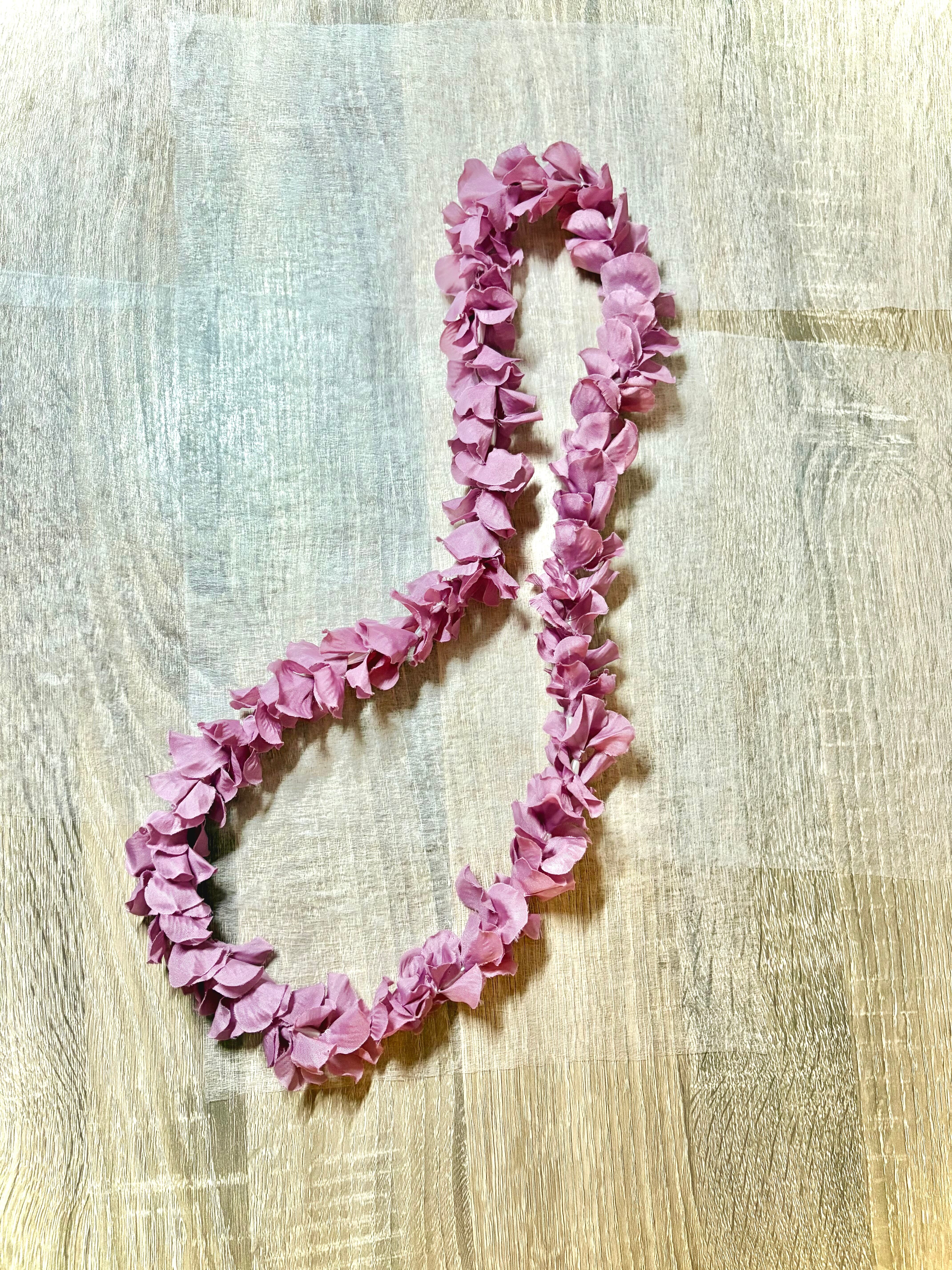 パープルがかったモーブピンクの花とデザインビーズが美しく連なるレイです。
