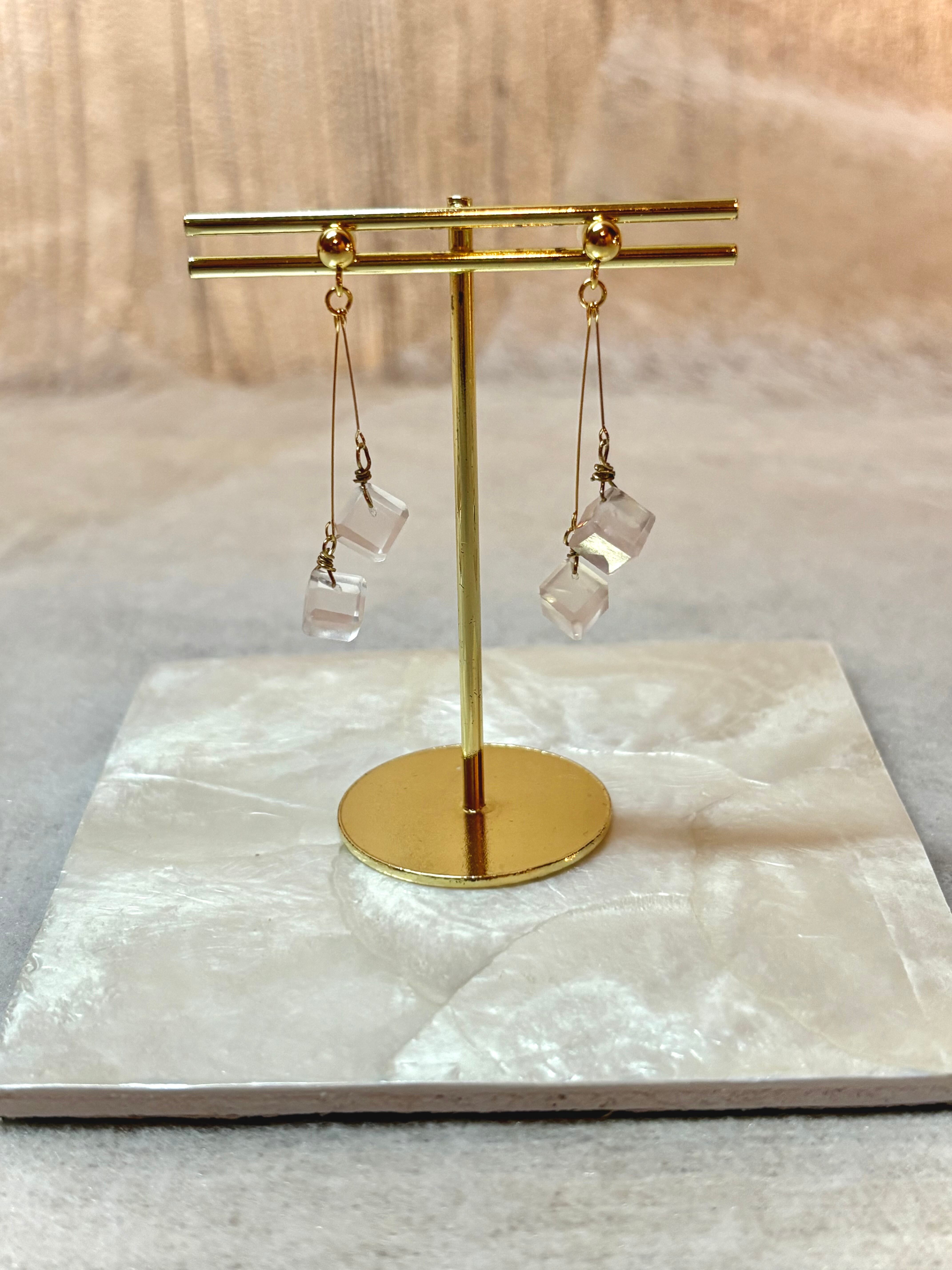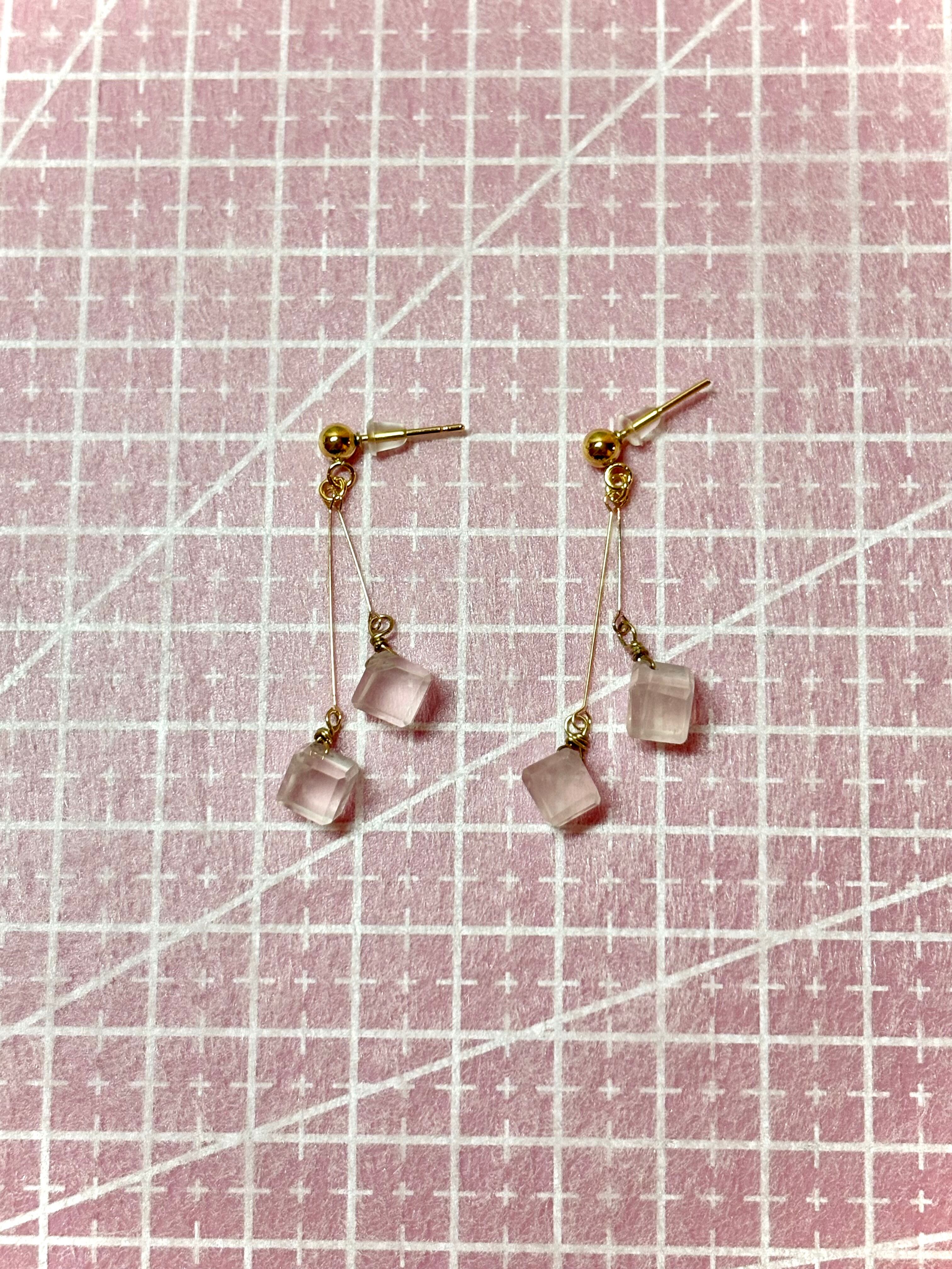 美しいローズクォーツが輝くキューブ型のピアスです。
