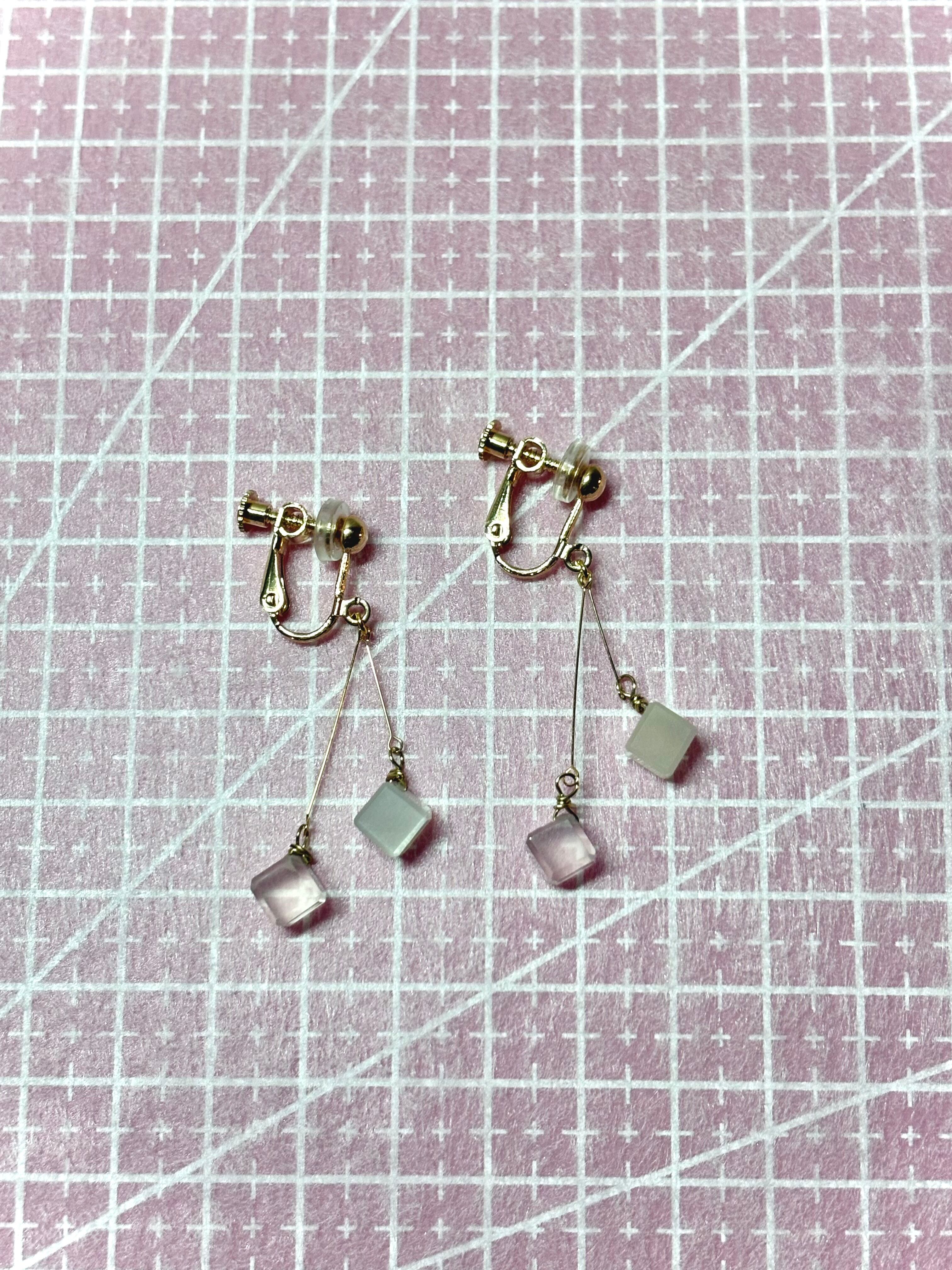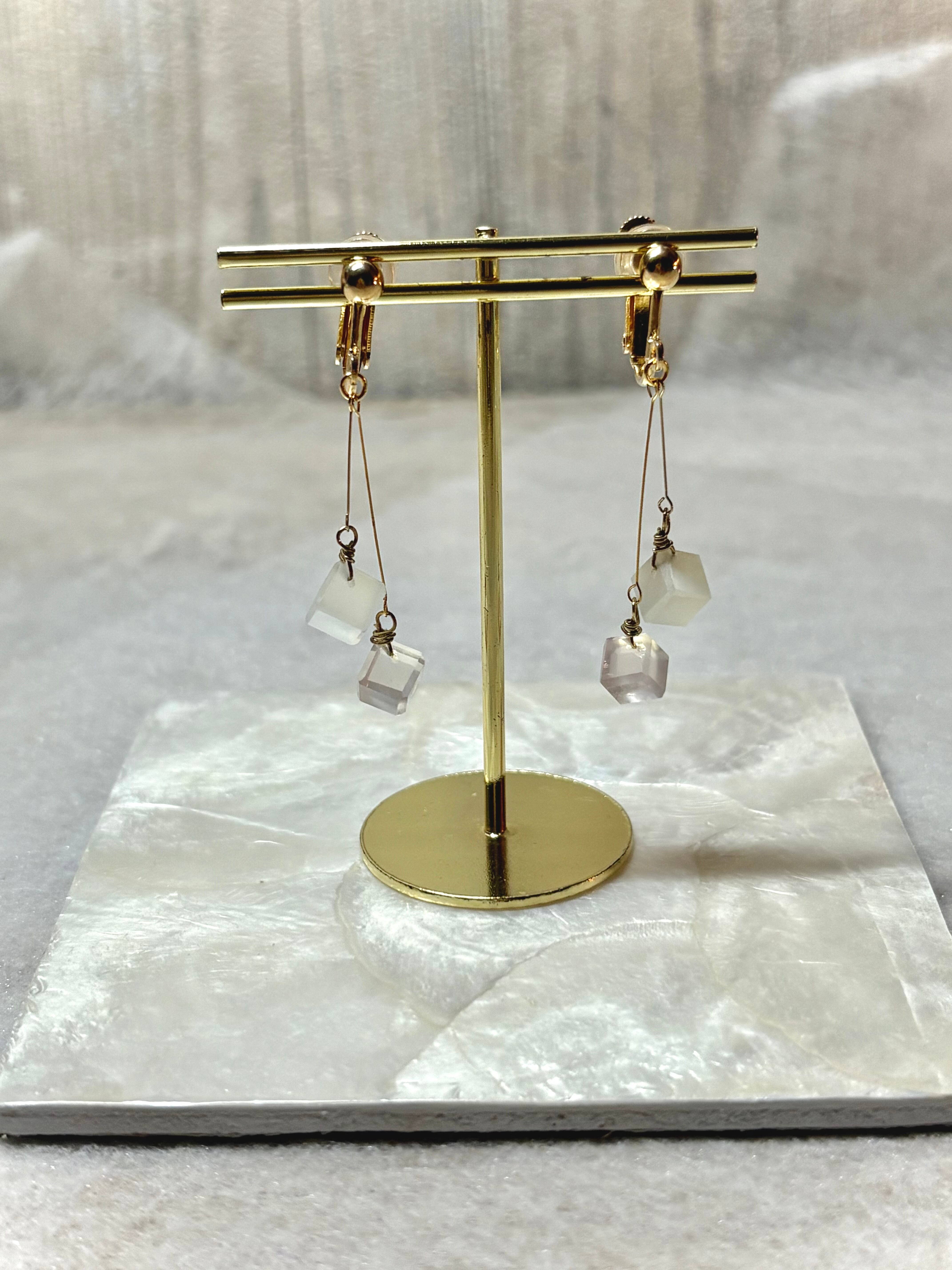 美しいムーンストーンとローズクォーツが輝くキューブ型のイヤリングです。