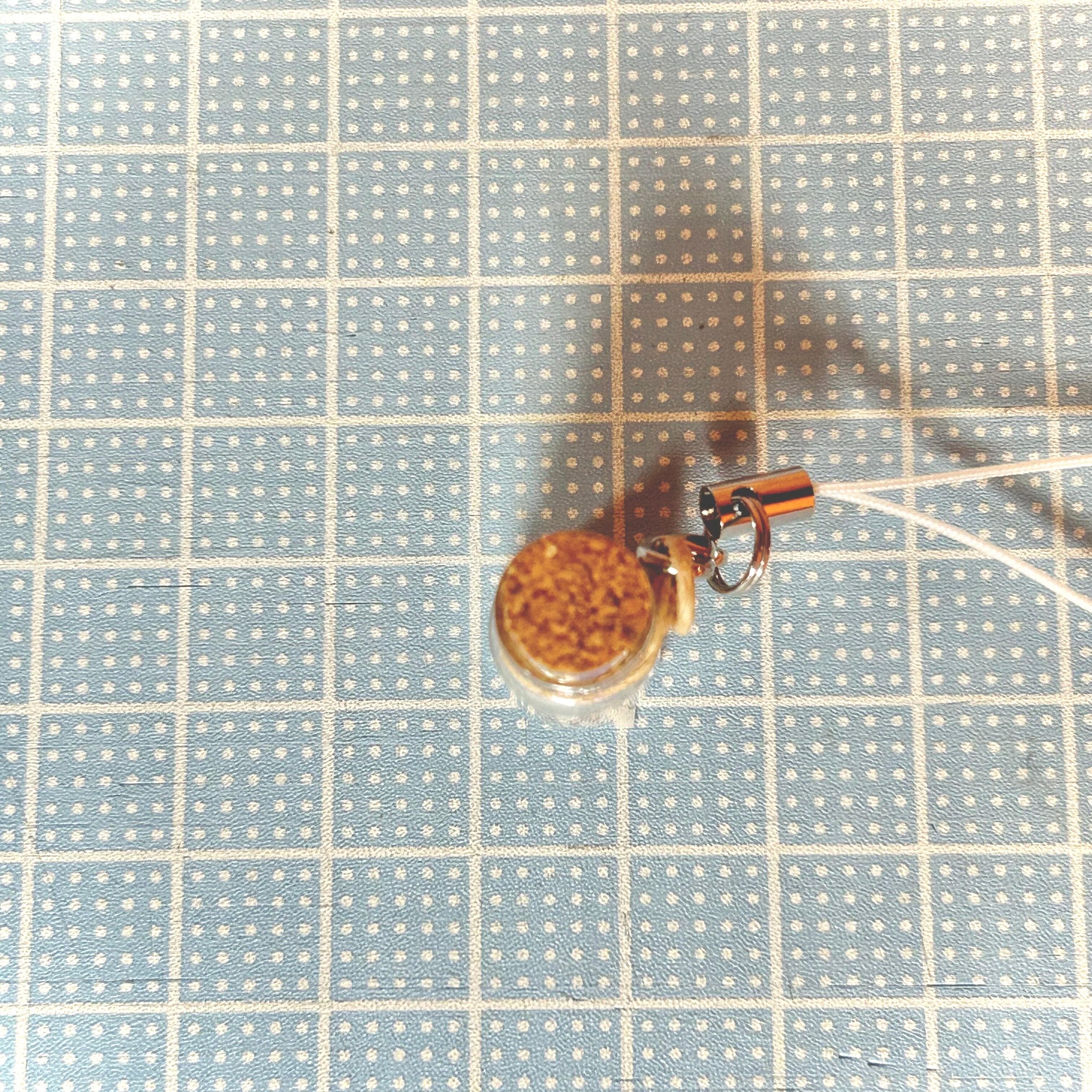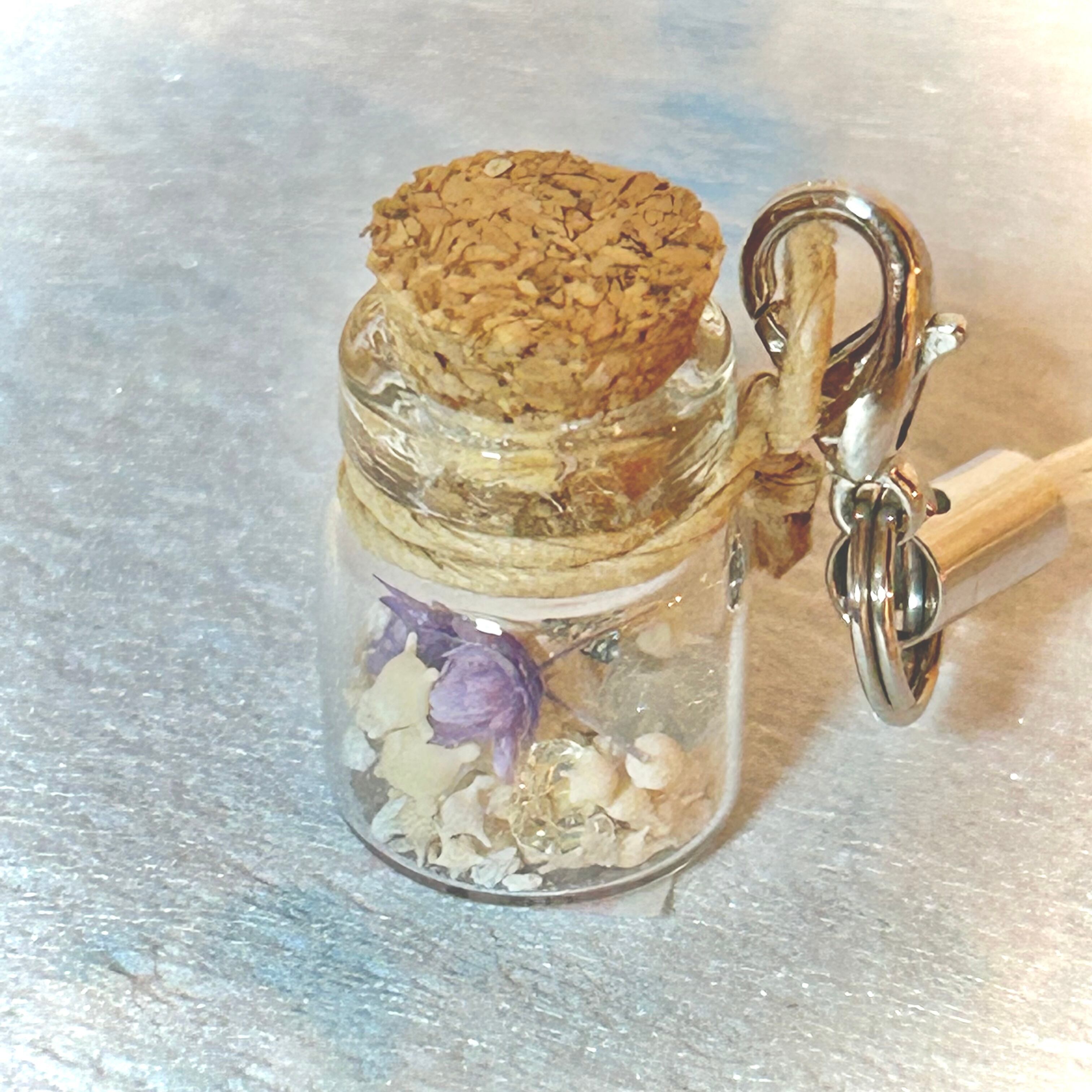 約1センチの小さなガラス瓶の中に、星の砂や天然石、花やキラキラを詰め込みました。