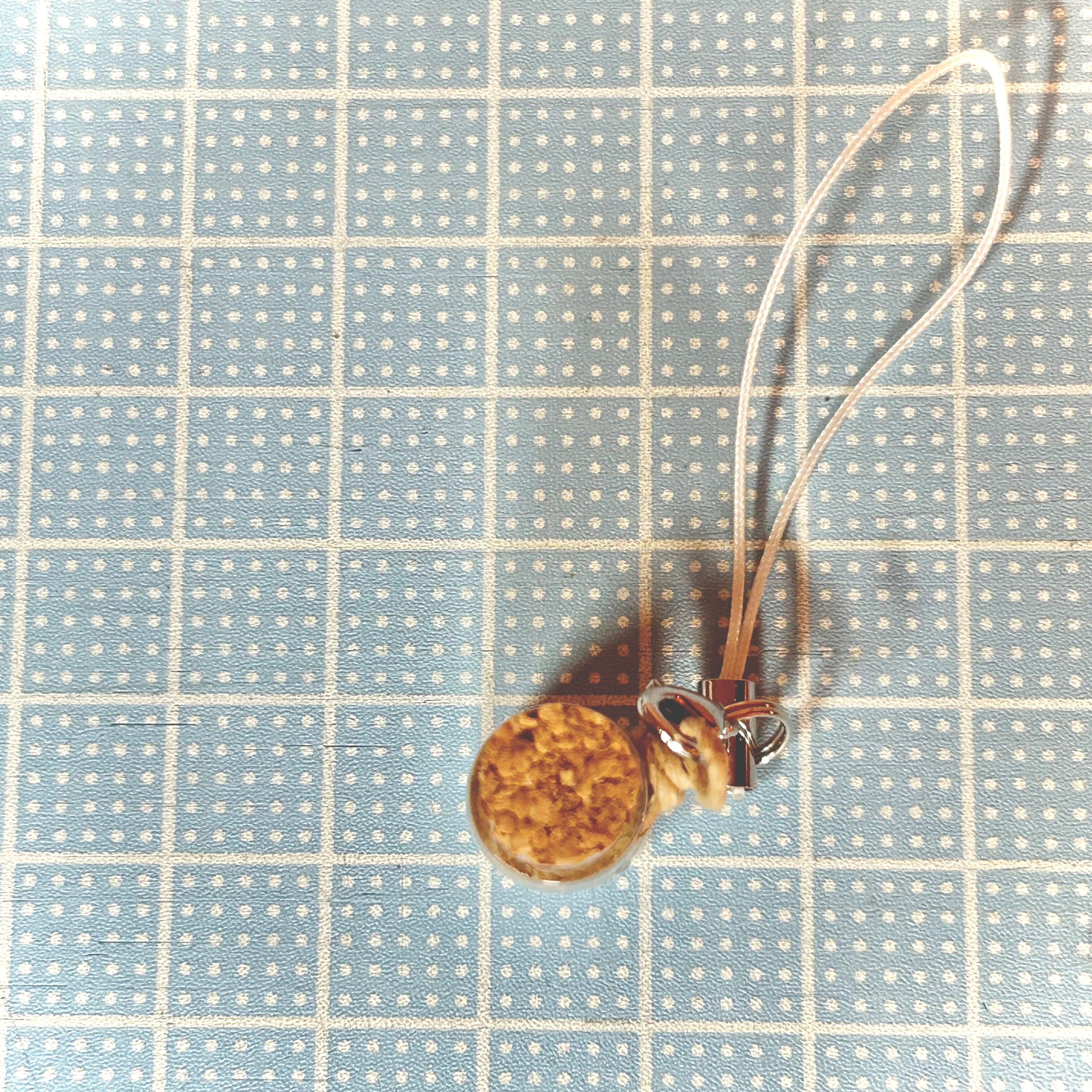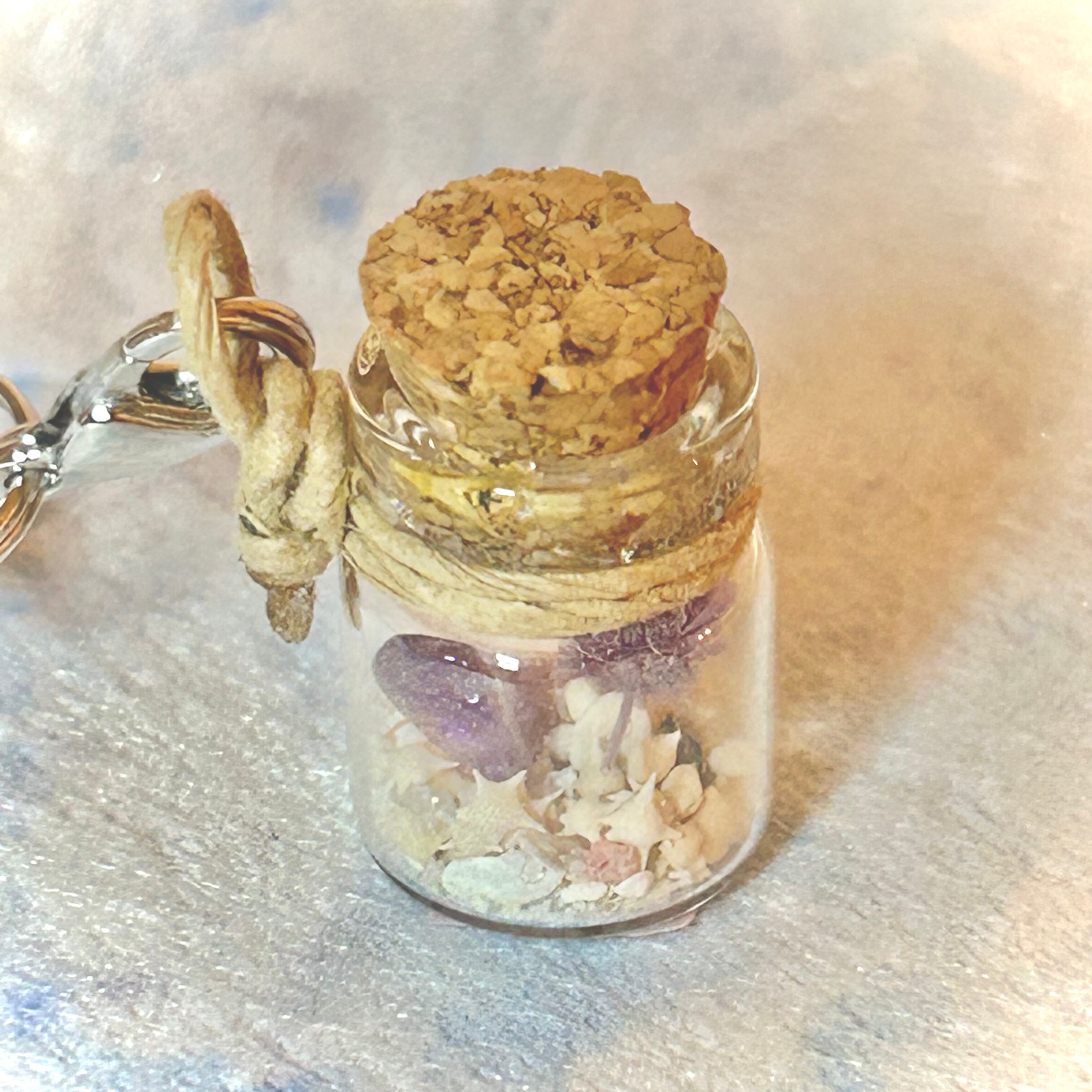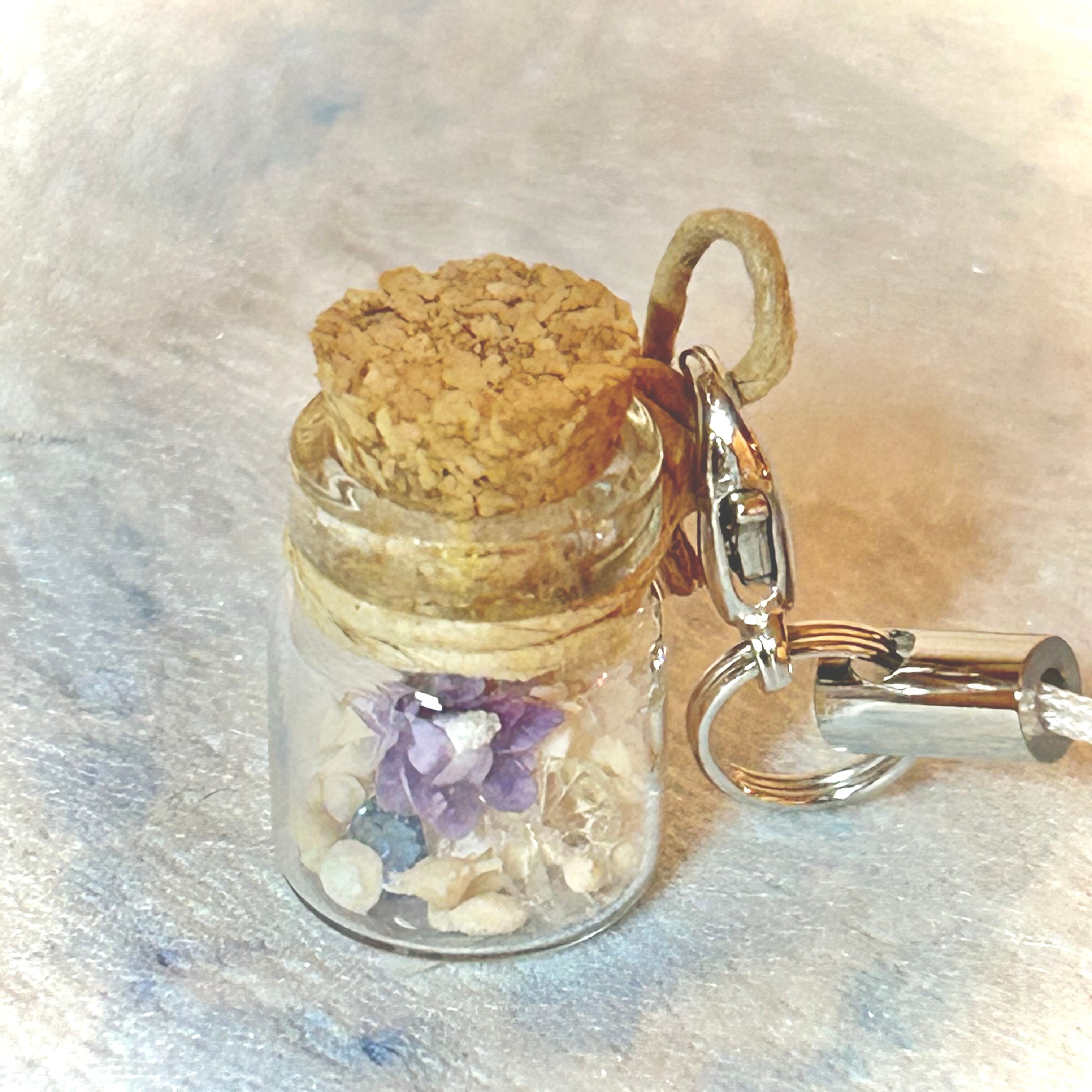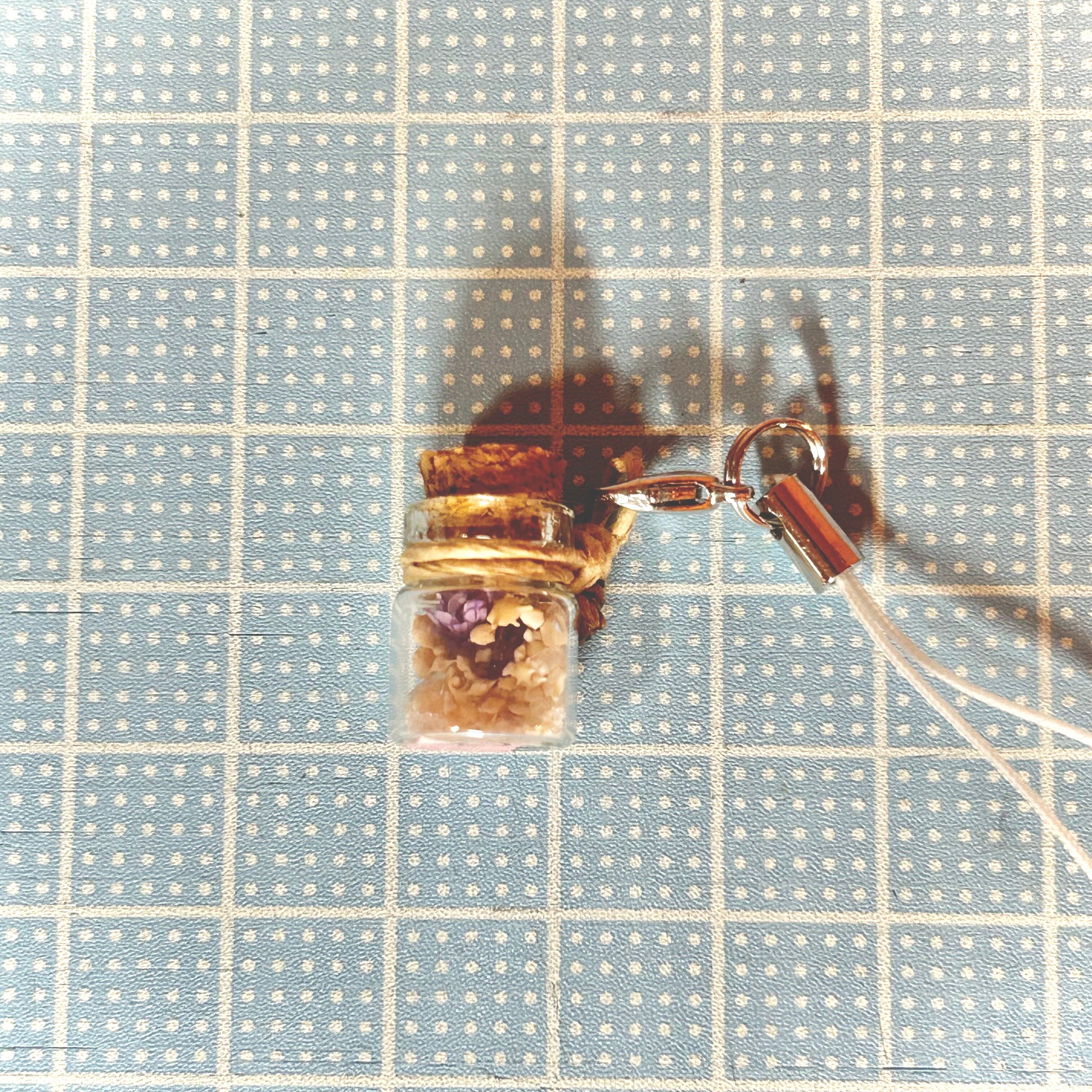 約1センチの小さなガラス瓶の中に、星の砂や天然石、花やキラキラを詰め込みました。