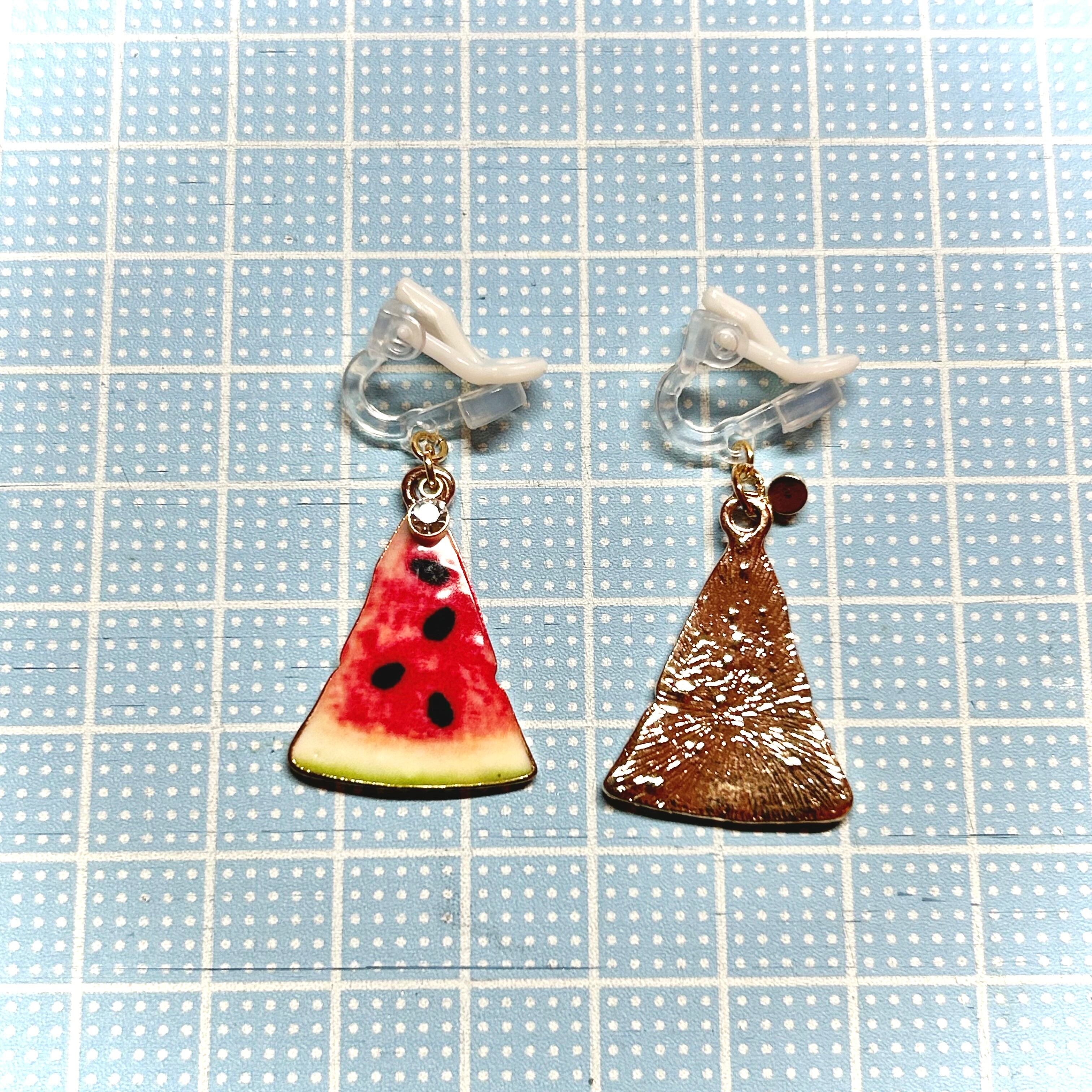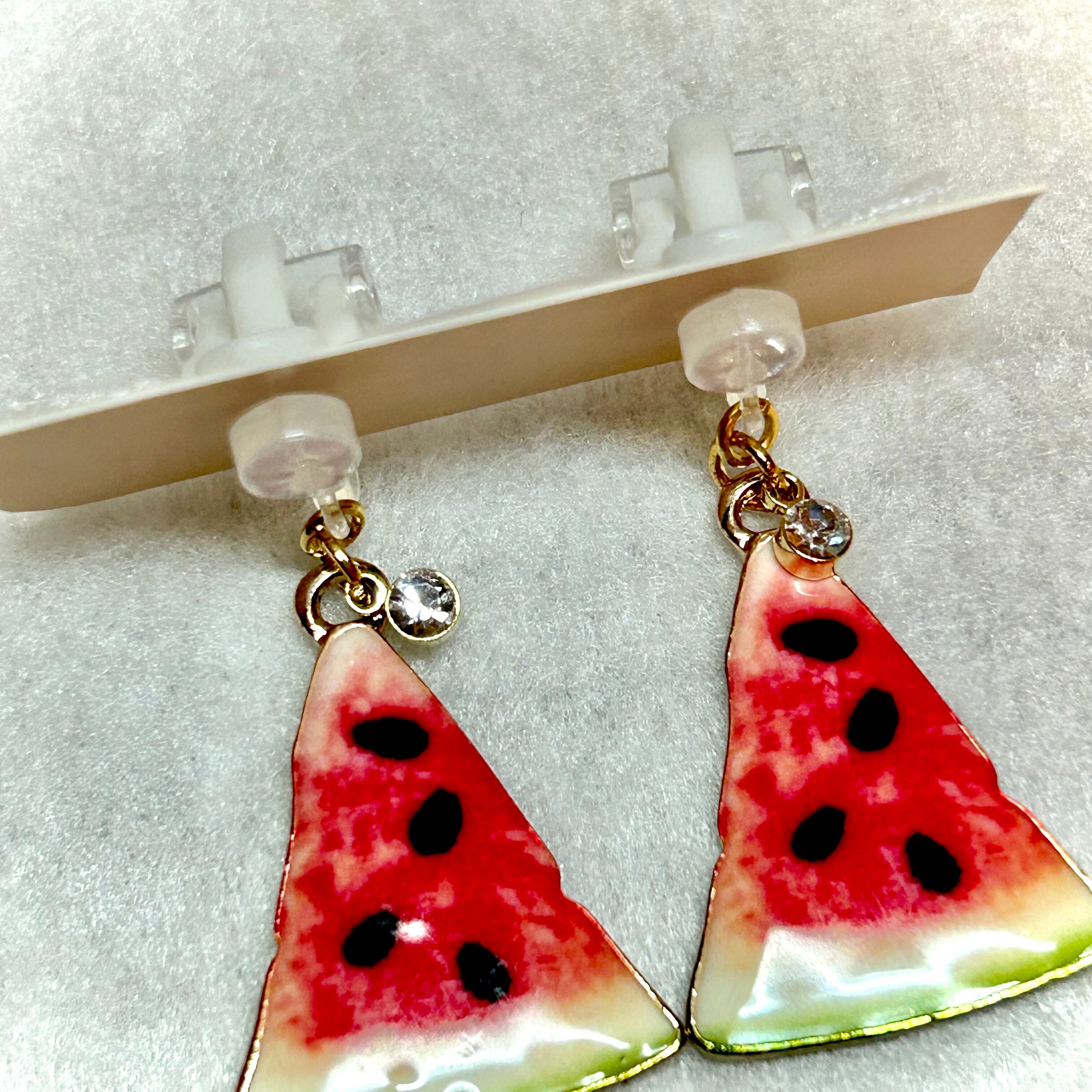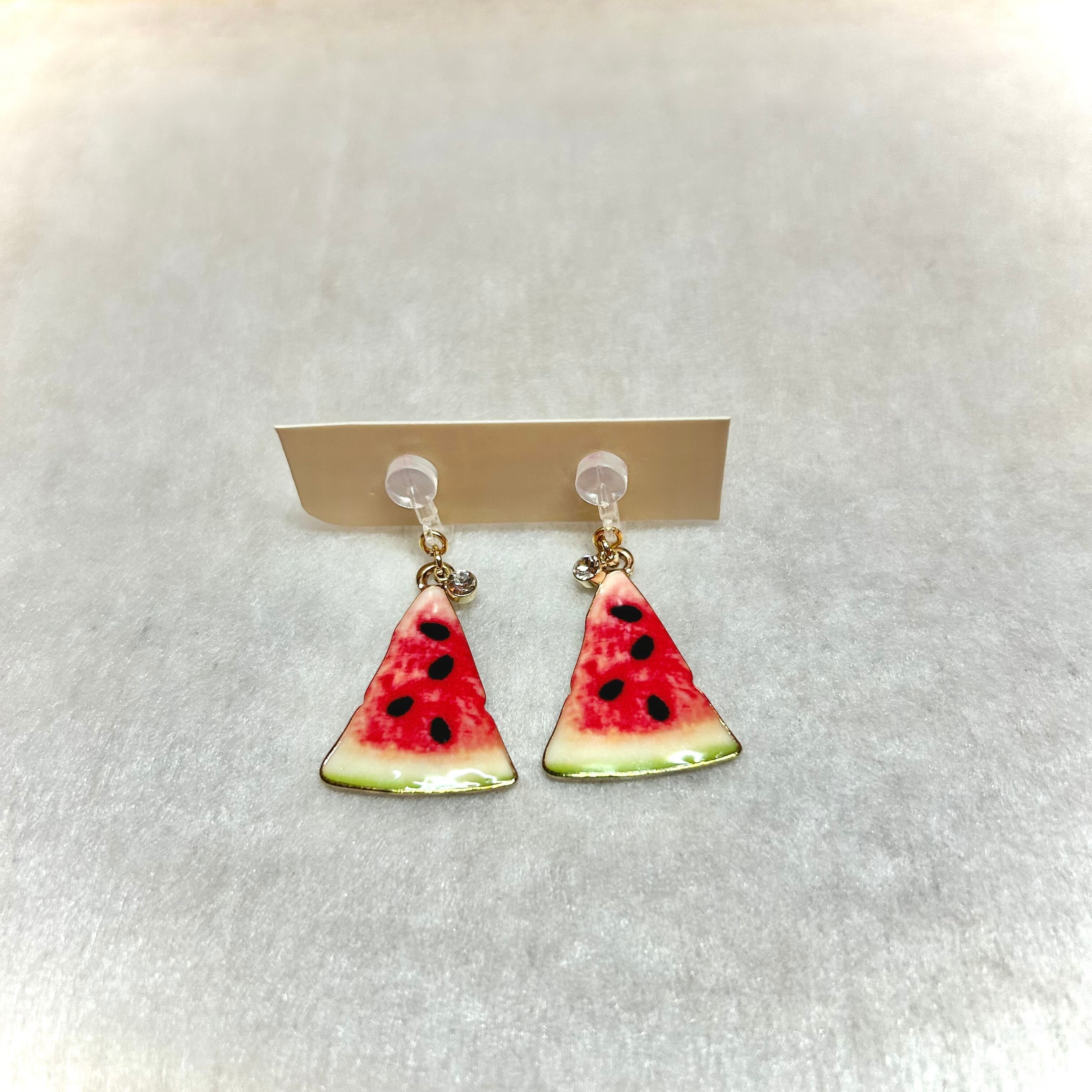 ツヤっとしたスイカの断面に、キラリンとしたビジューがポイントの、キュートで華やかなイヤリング