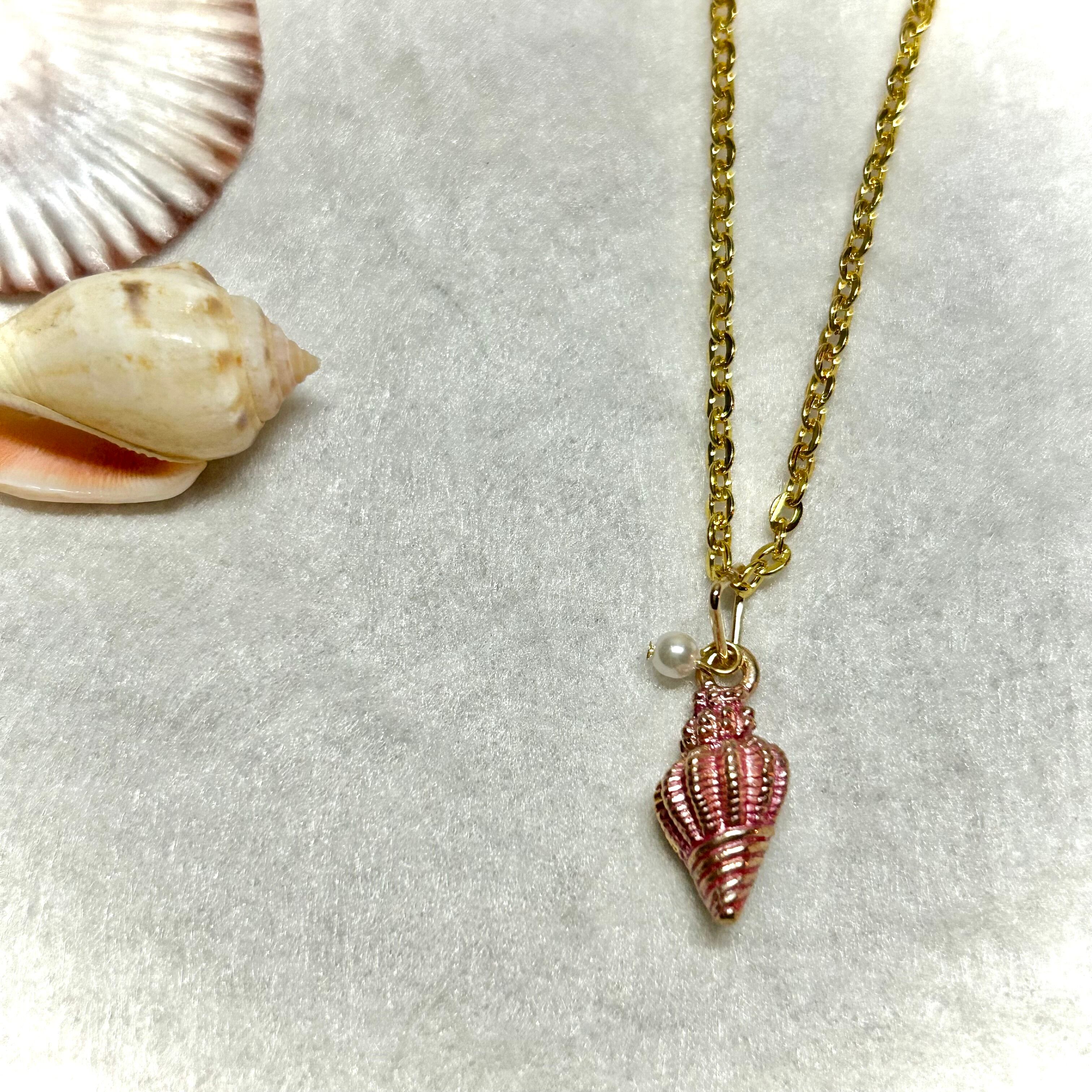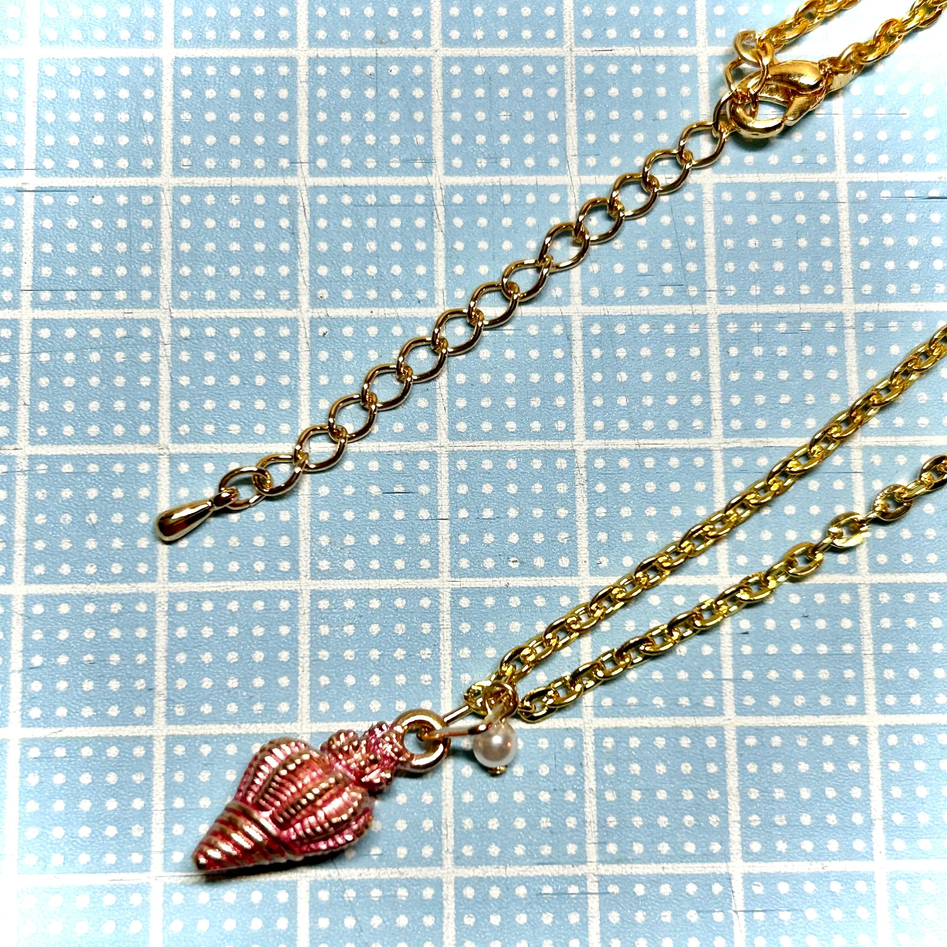 チェーンと貝殻モチーフを繋いでいるのは、丸カンではなくて、三角カン。テトラポットのイメージを思わせるデザインとなっております。