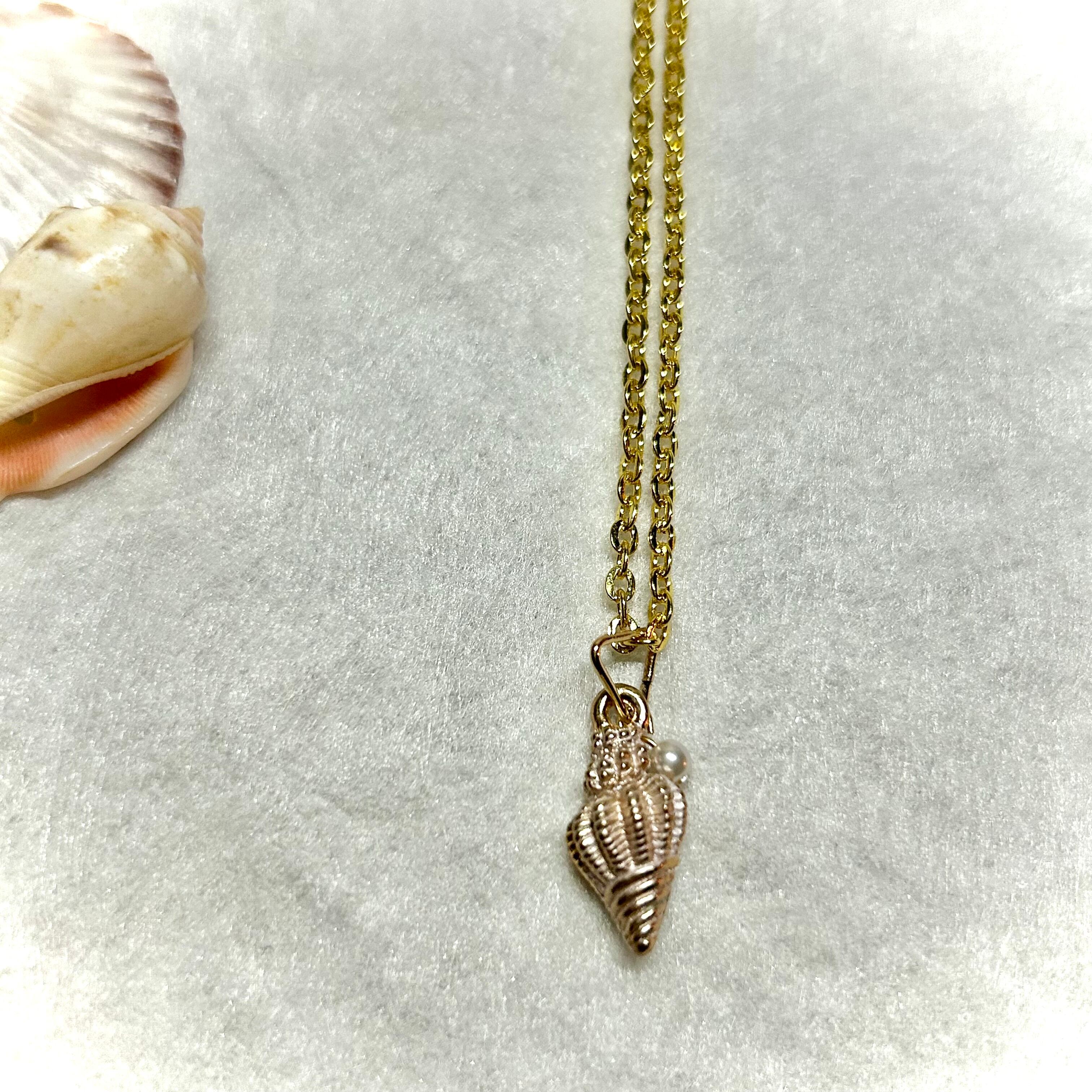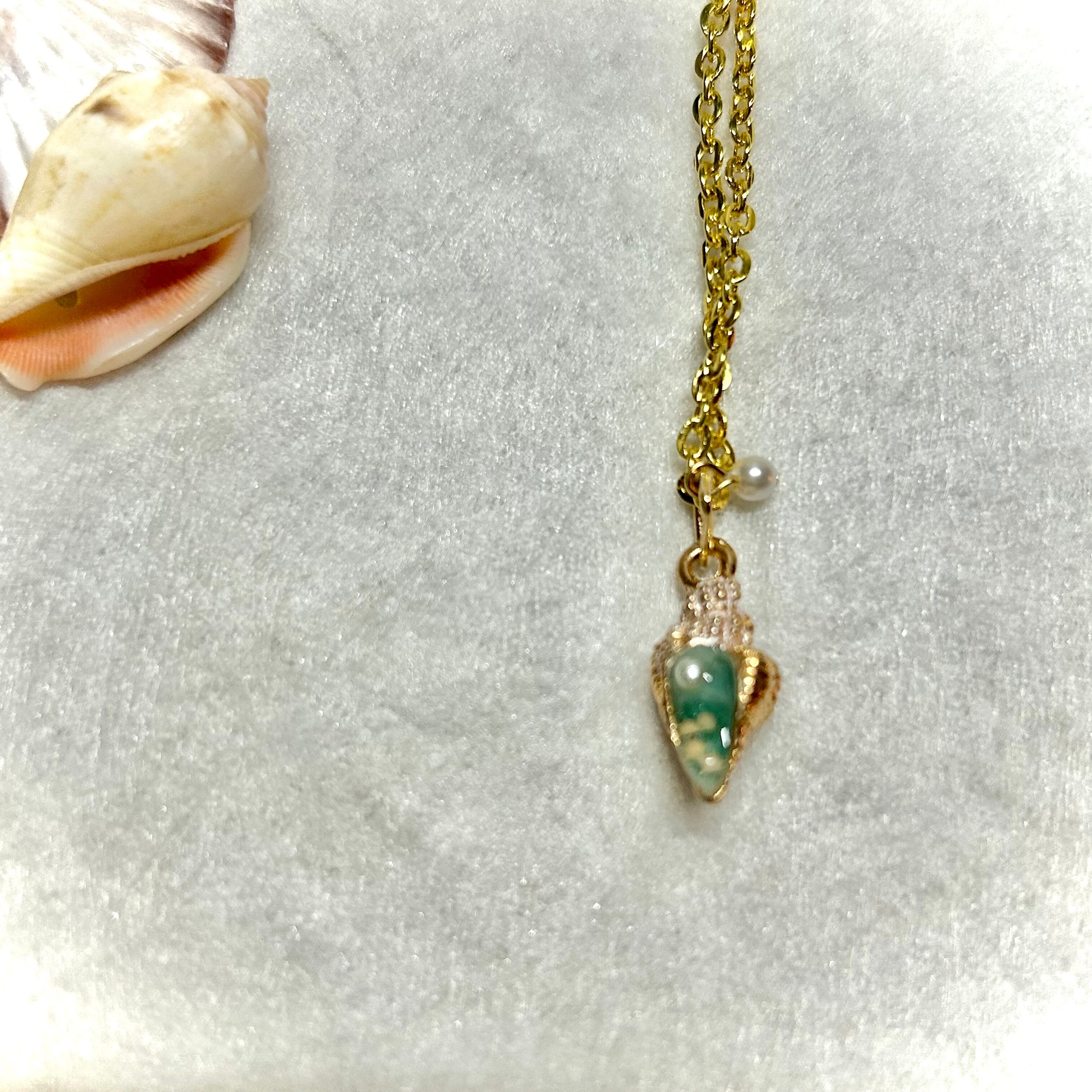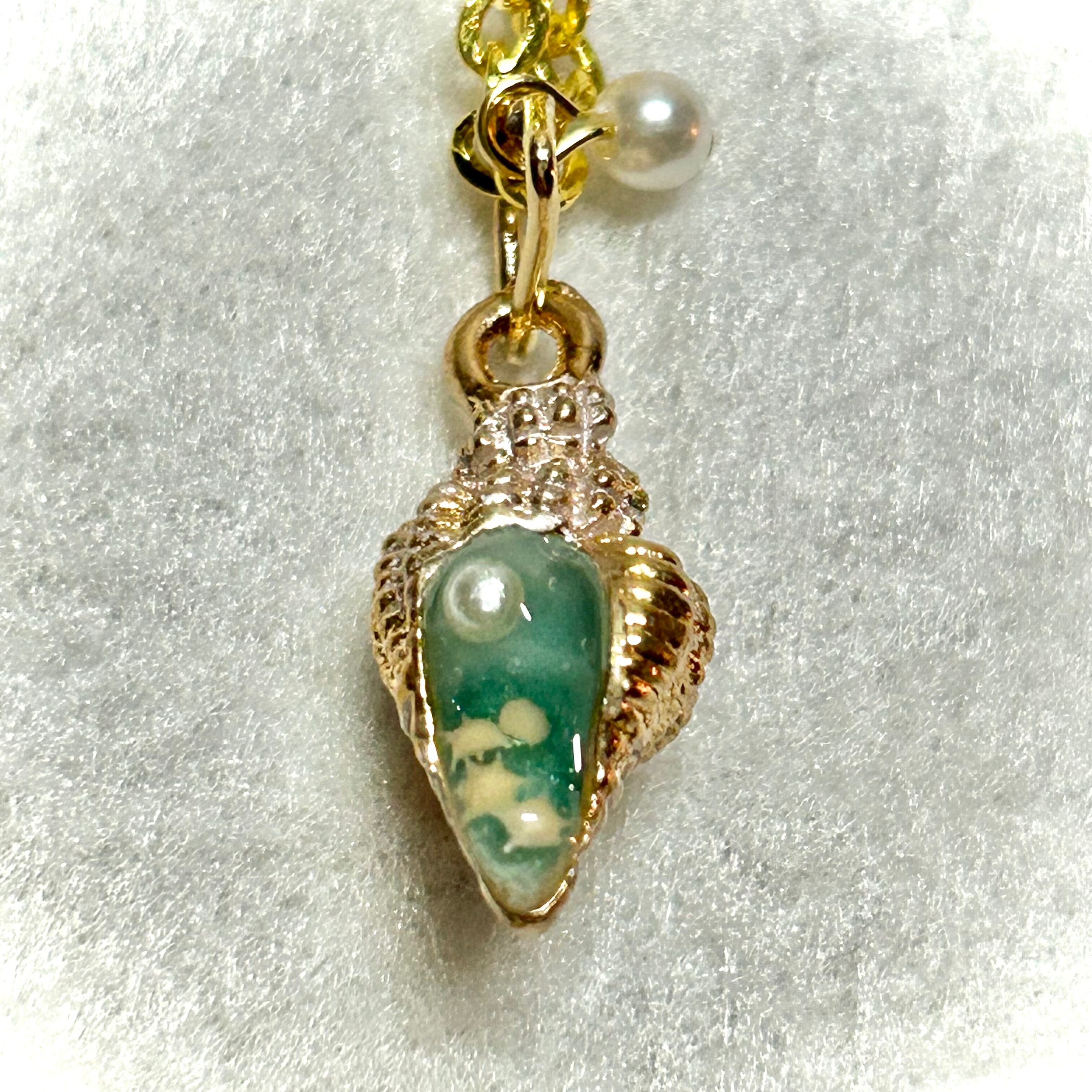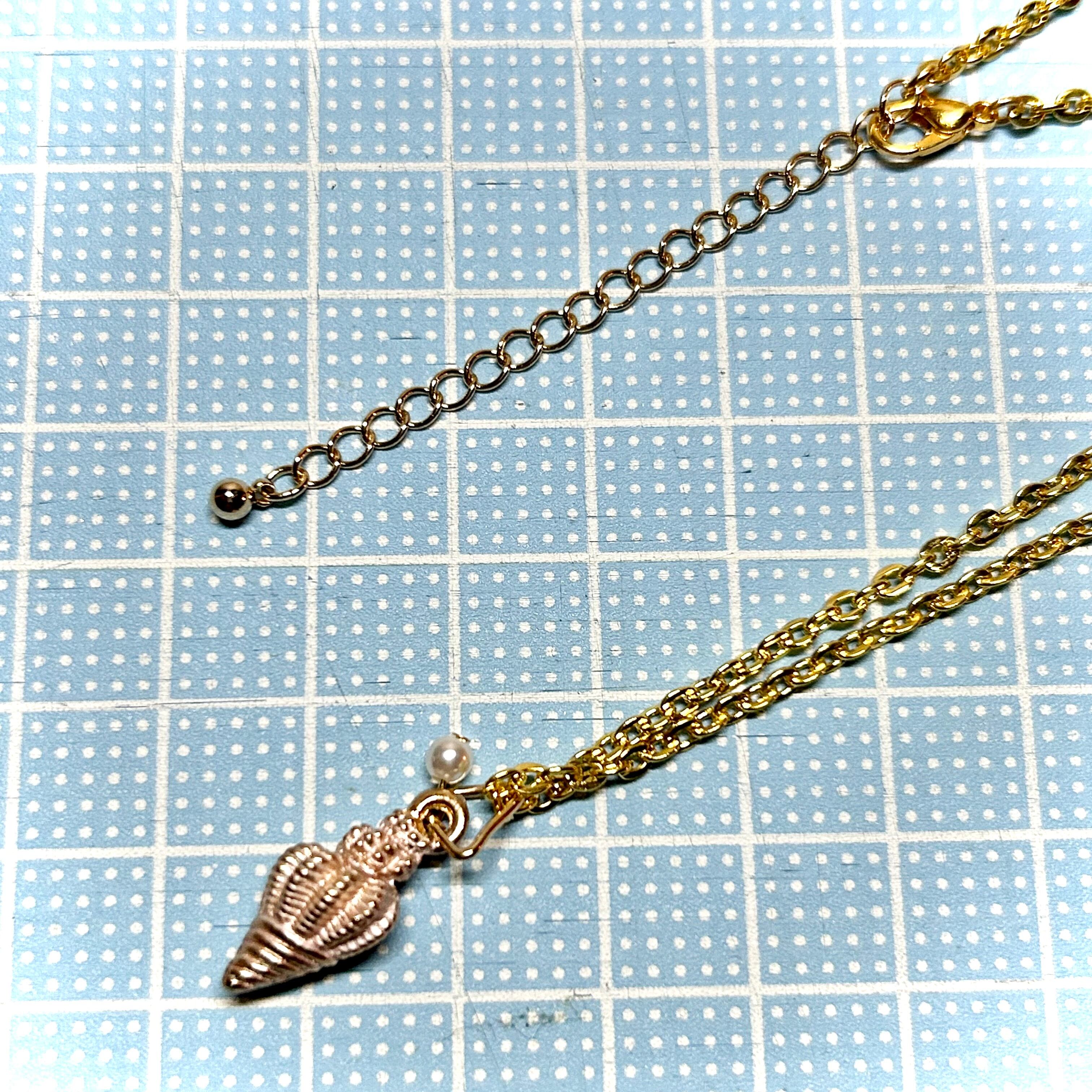 チェーンと貝殻モチーフを繋いでいるのは、丸カンではなくて、三角カン。テトラポットのイメージを思わせるデザインとなっております。
