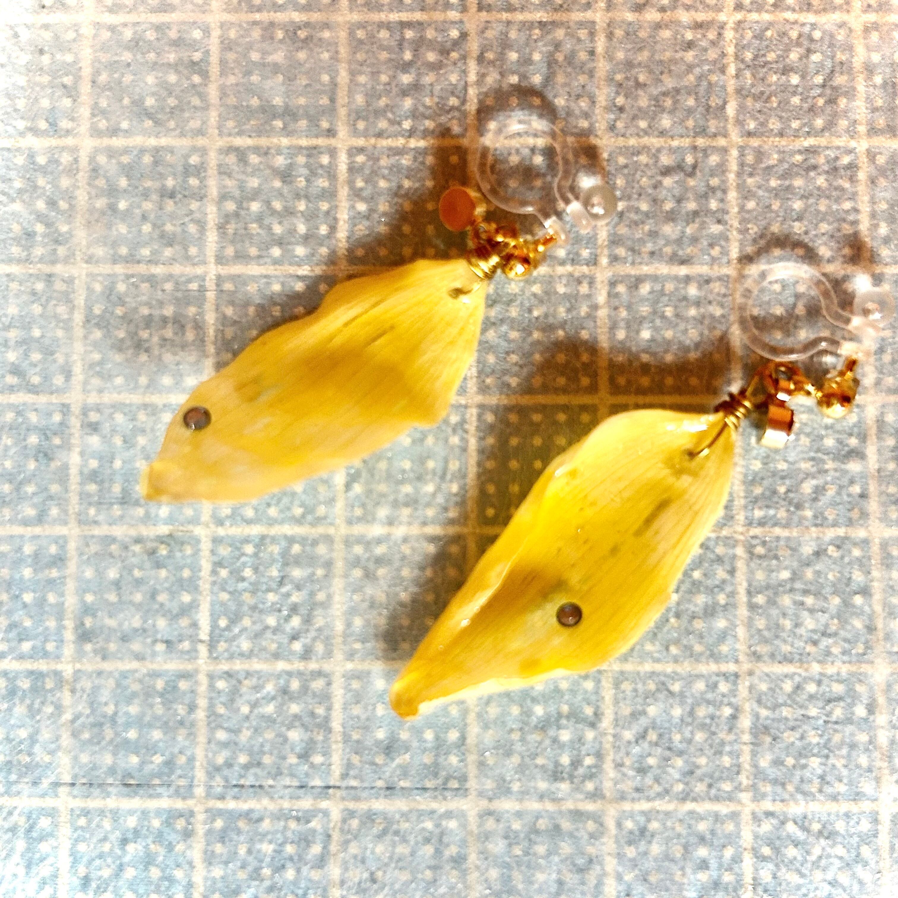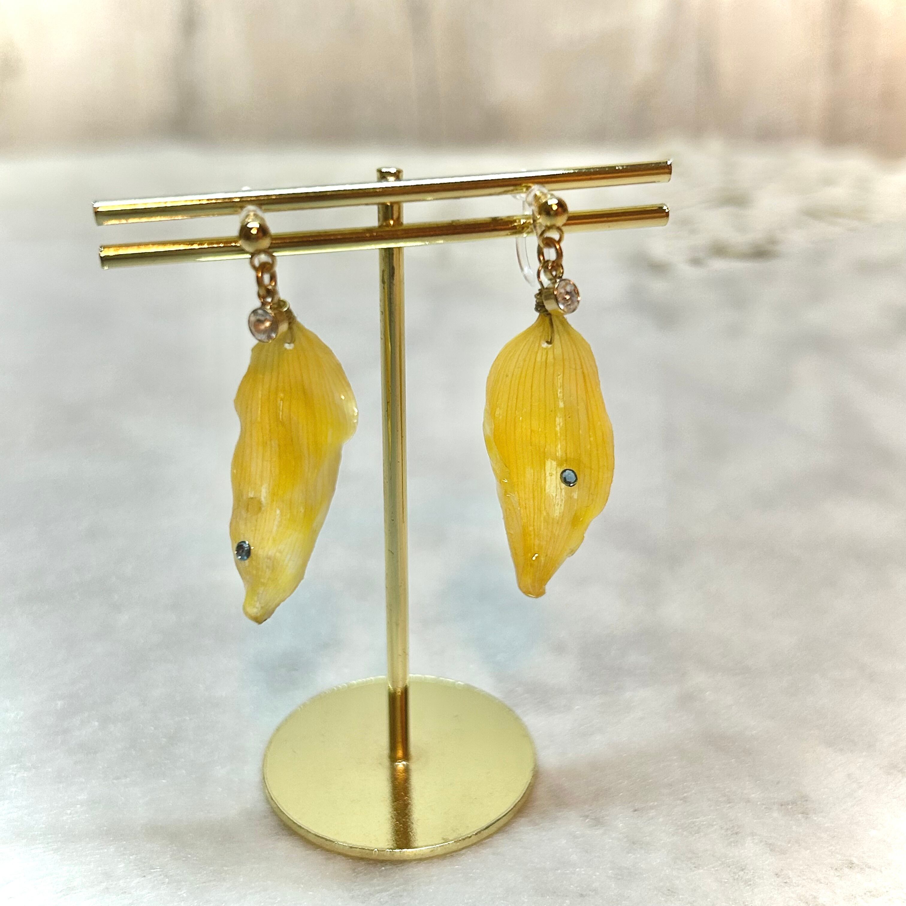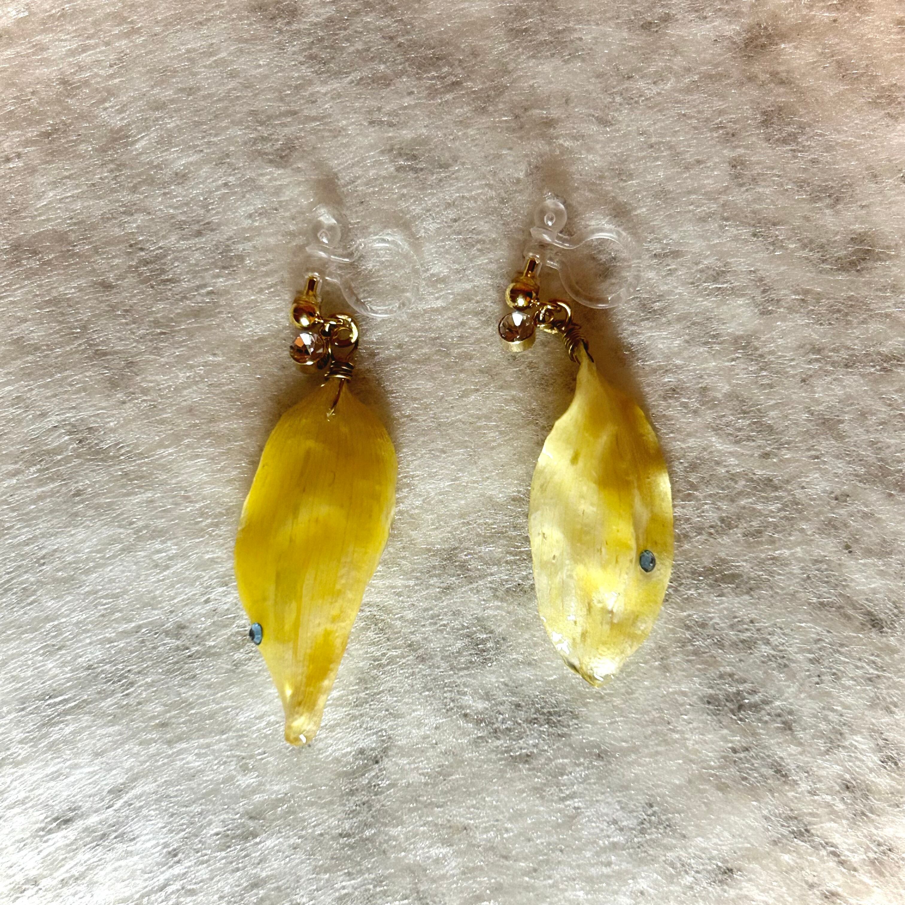 ひまわりの花びらに、ブルーのビジューが輝く花びらイヤリング(ノンホールピアス)