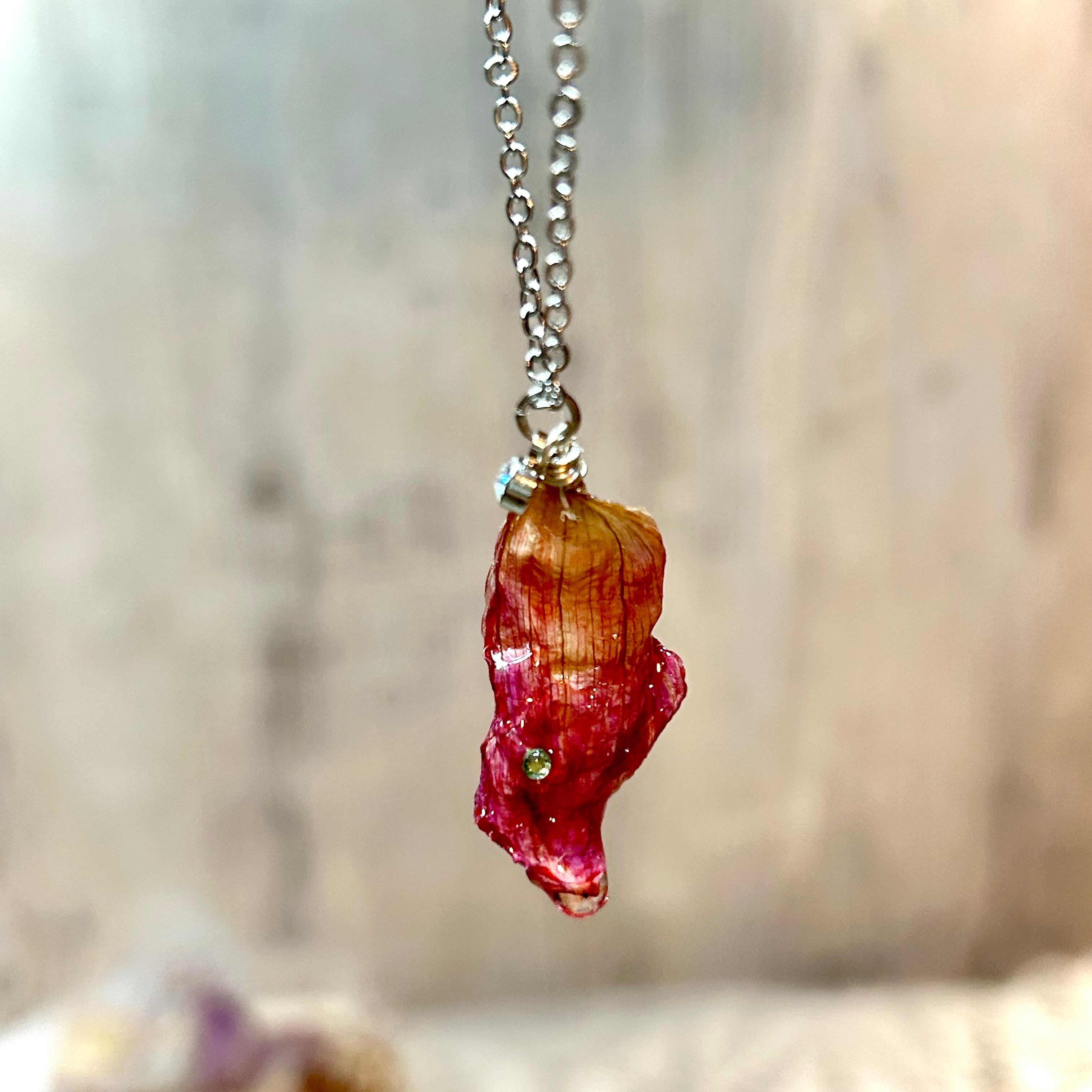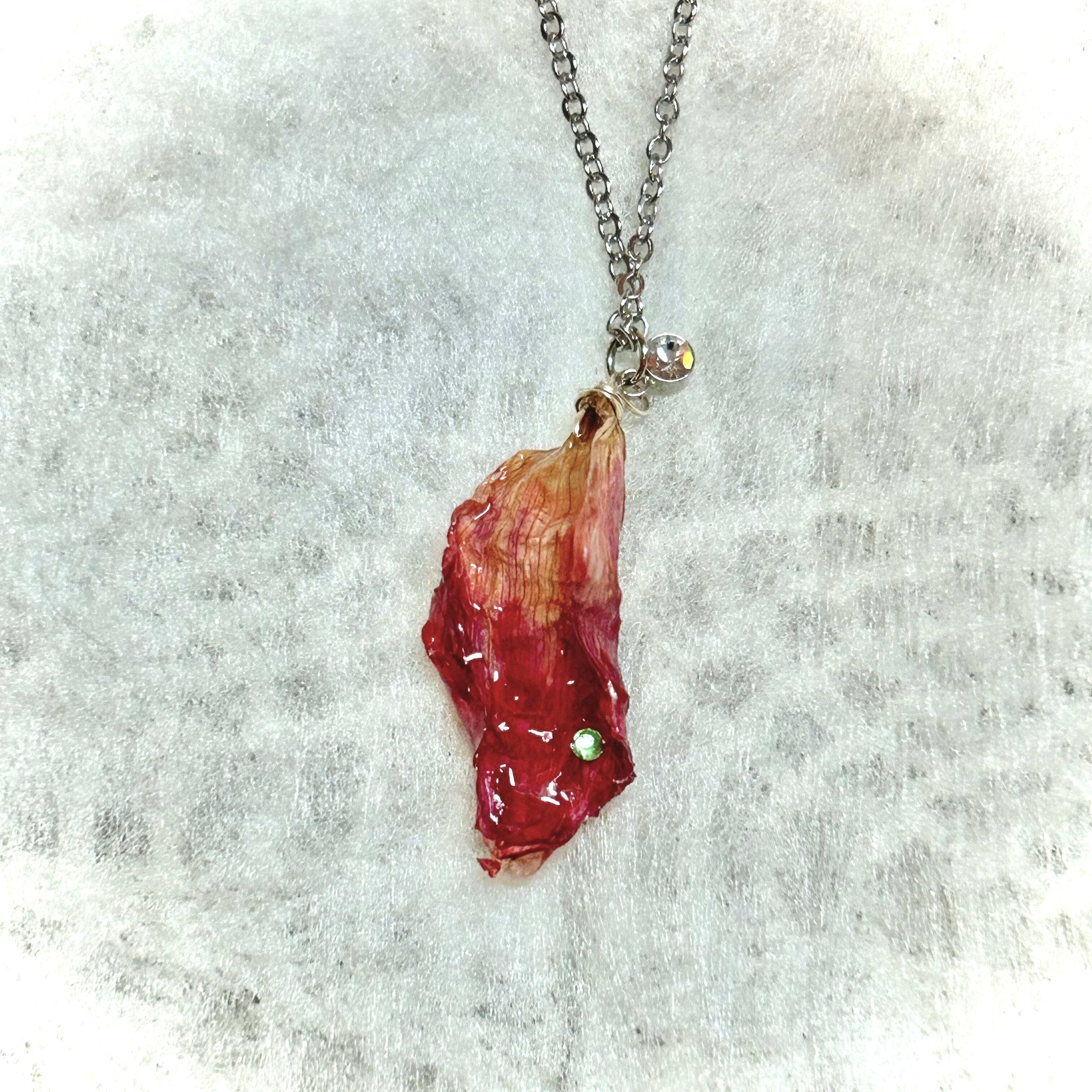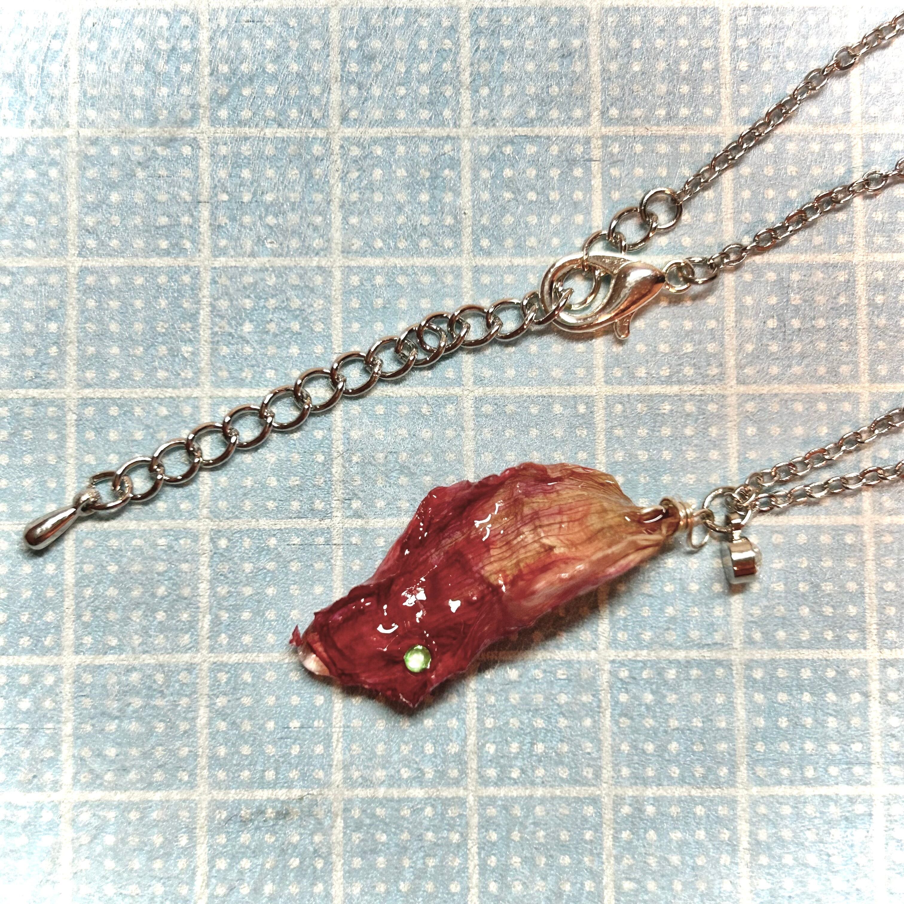 ダリアの花びらに、ミントグリーンのビジューが輝く花びらネックレス