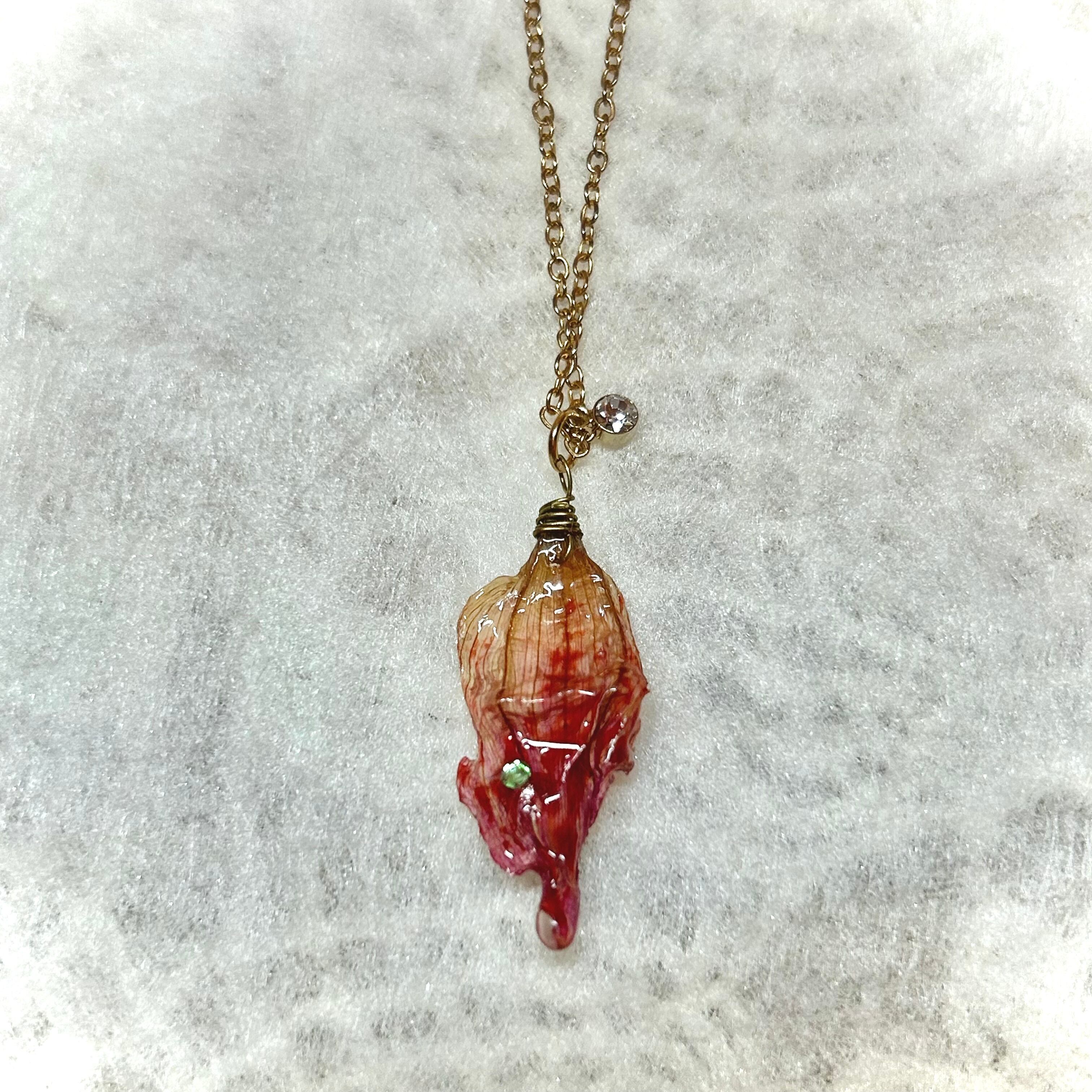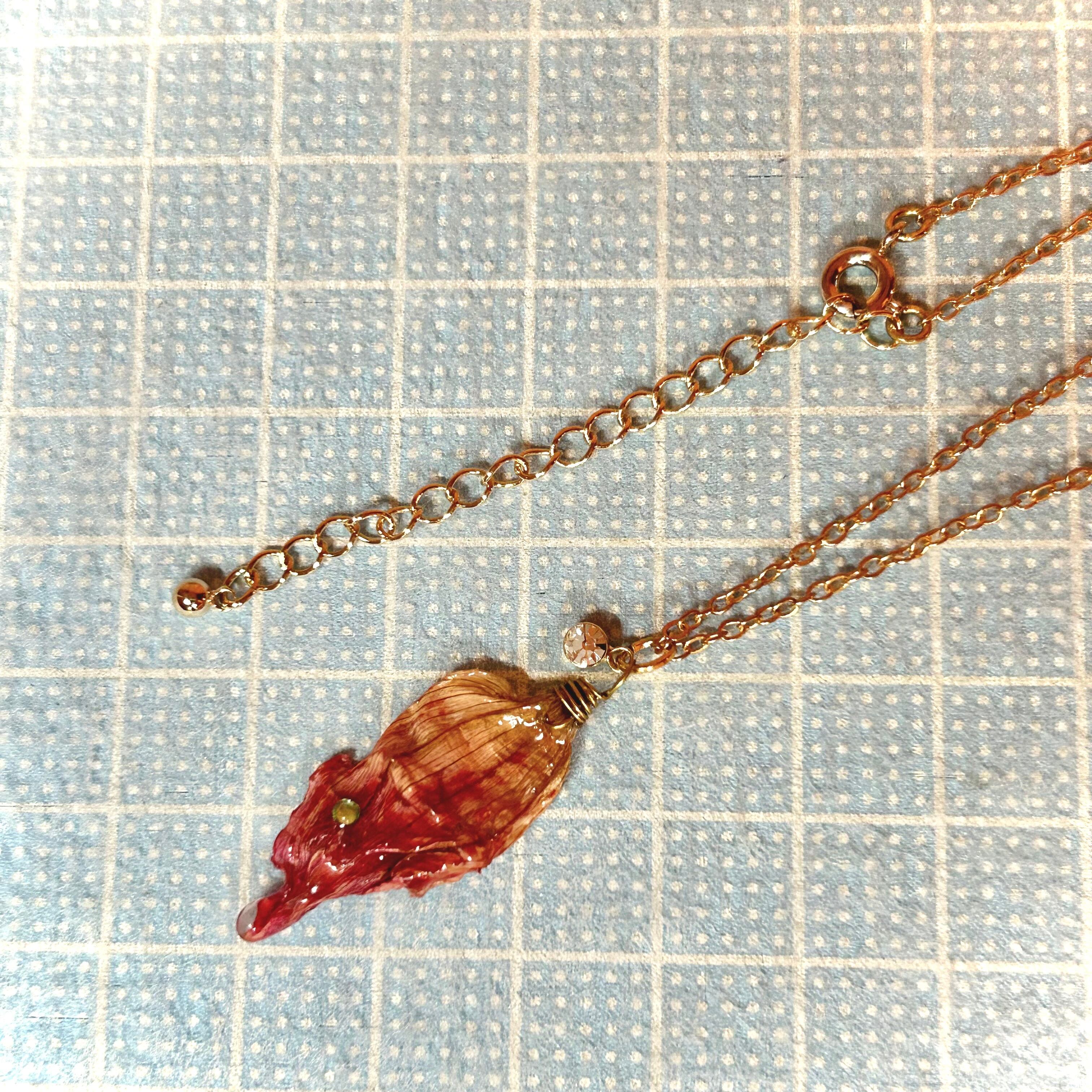 ダリアの花びらに、ミントグリーンのビジューが輝く花びらネックレス