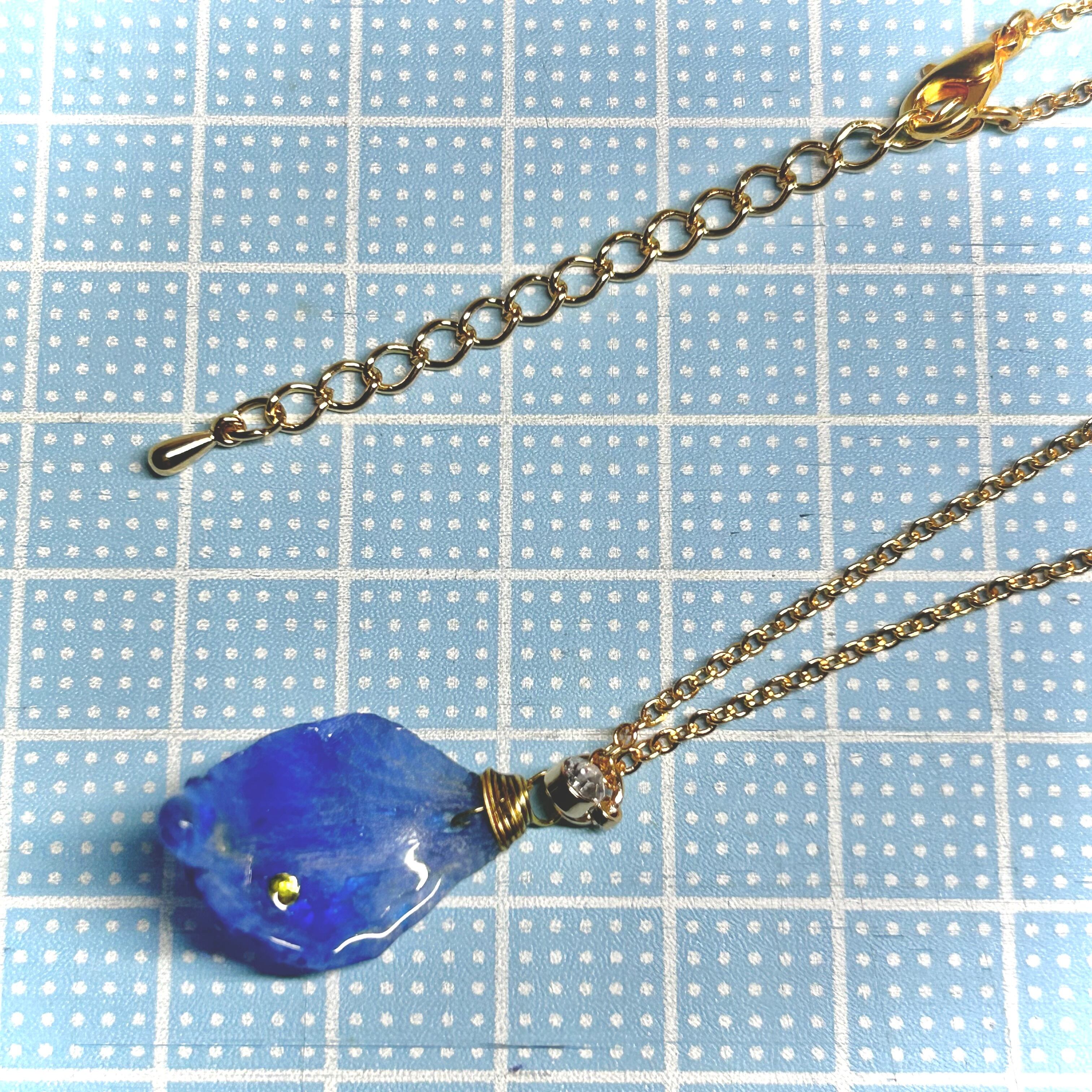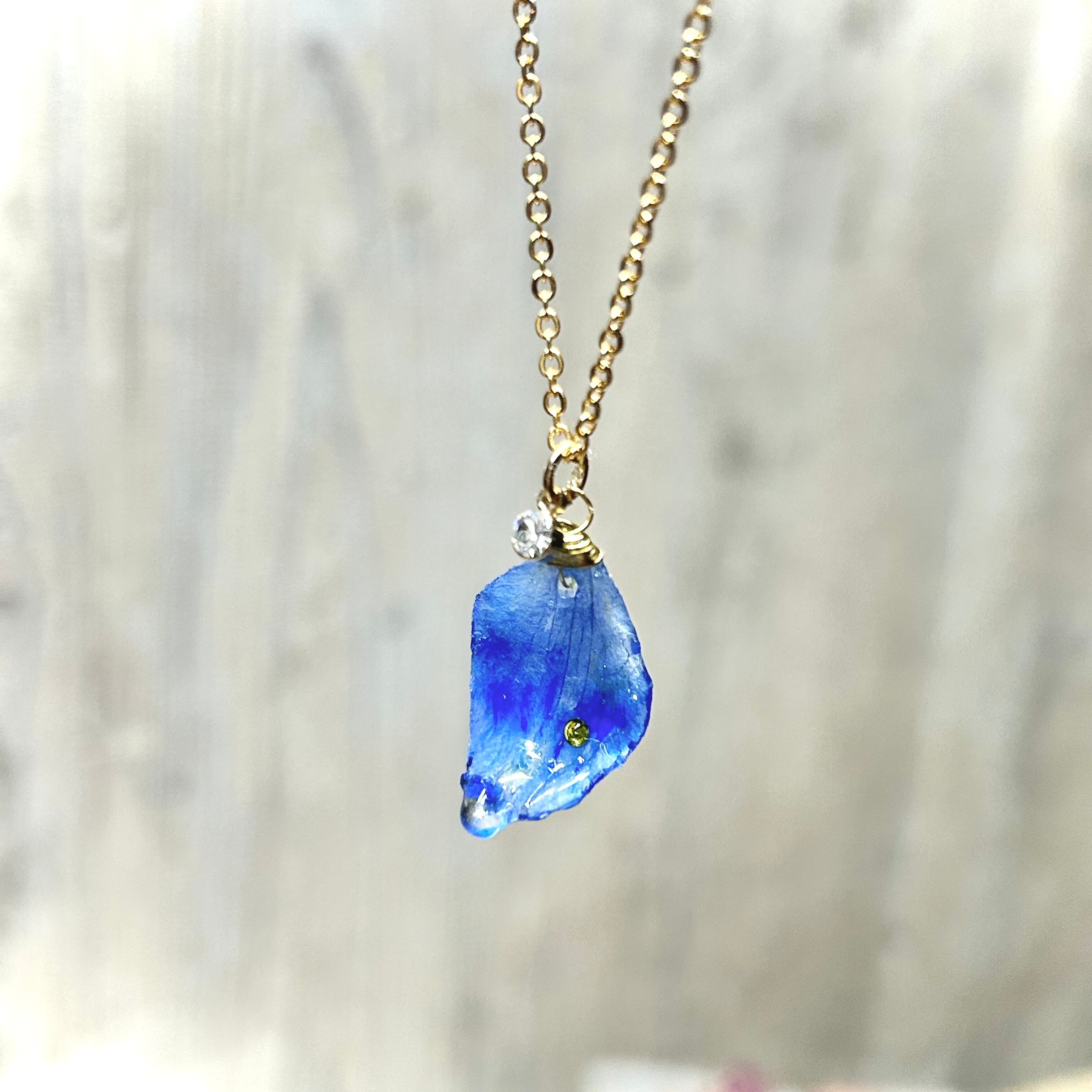 デルフィニウムの花びらに、パインイエローのビジューが輝く花びらネックレス