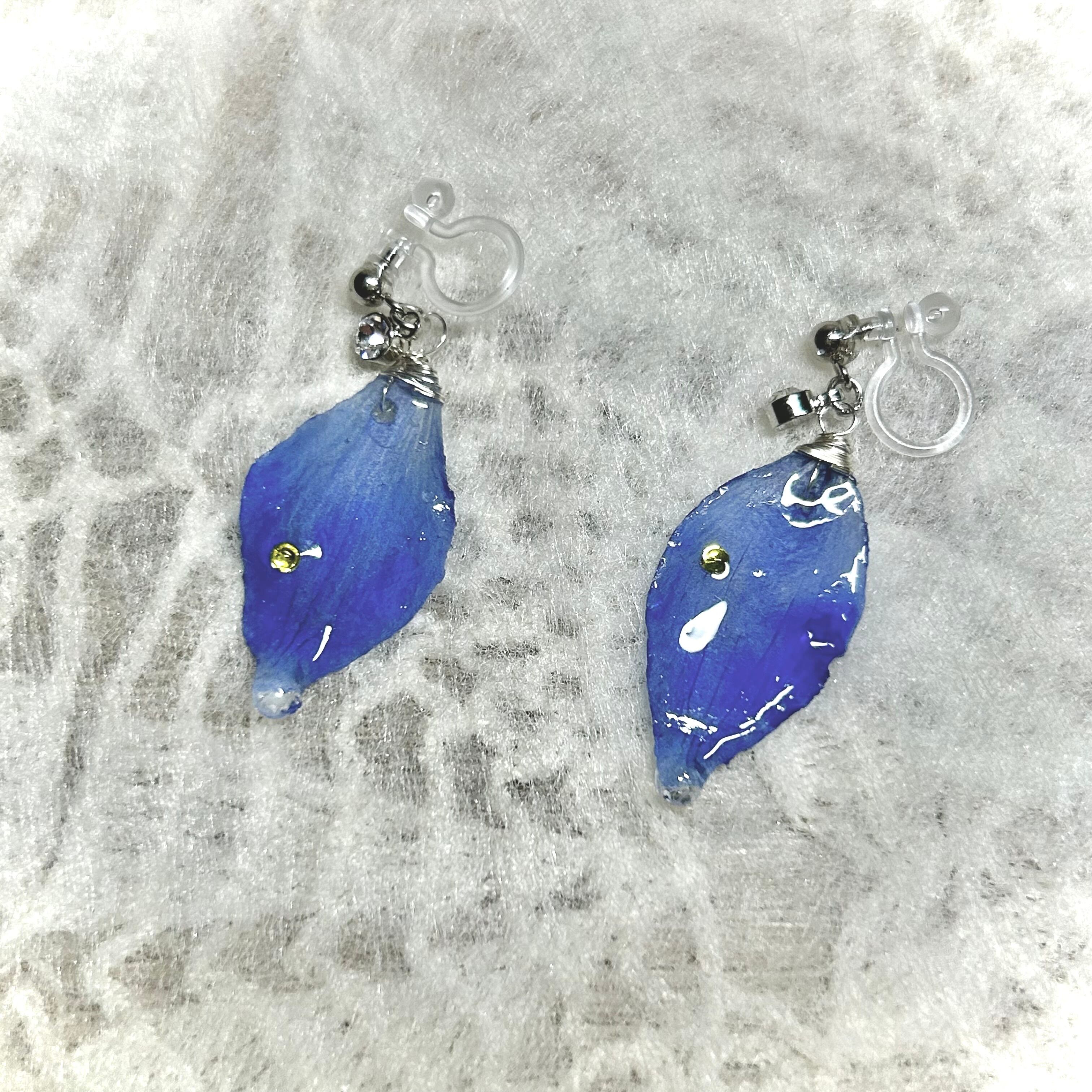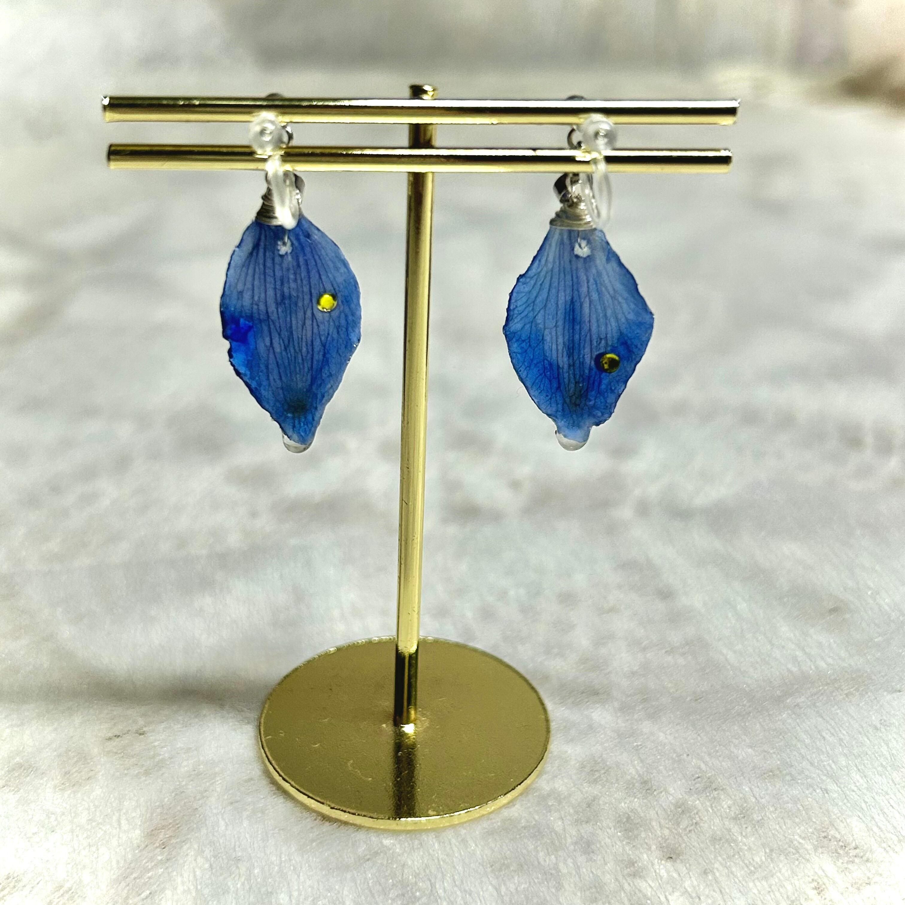 デルフィニウムの花びらに、パインイエローのビジューが輝く花びらイヤリング(ノンホールピアス)