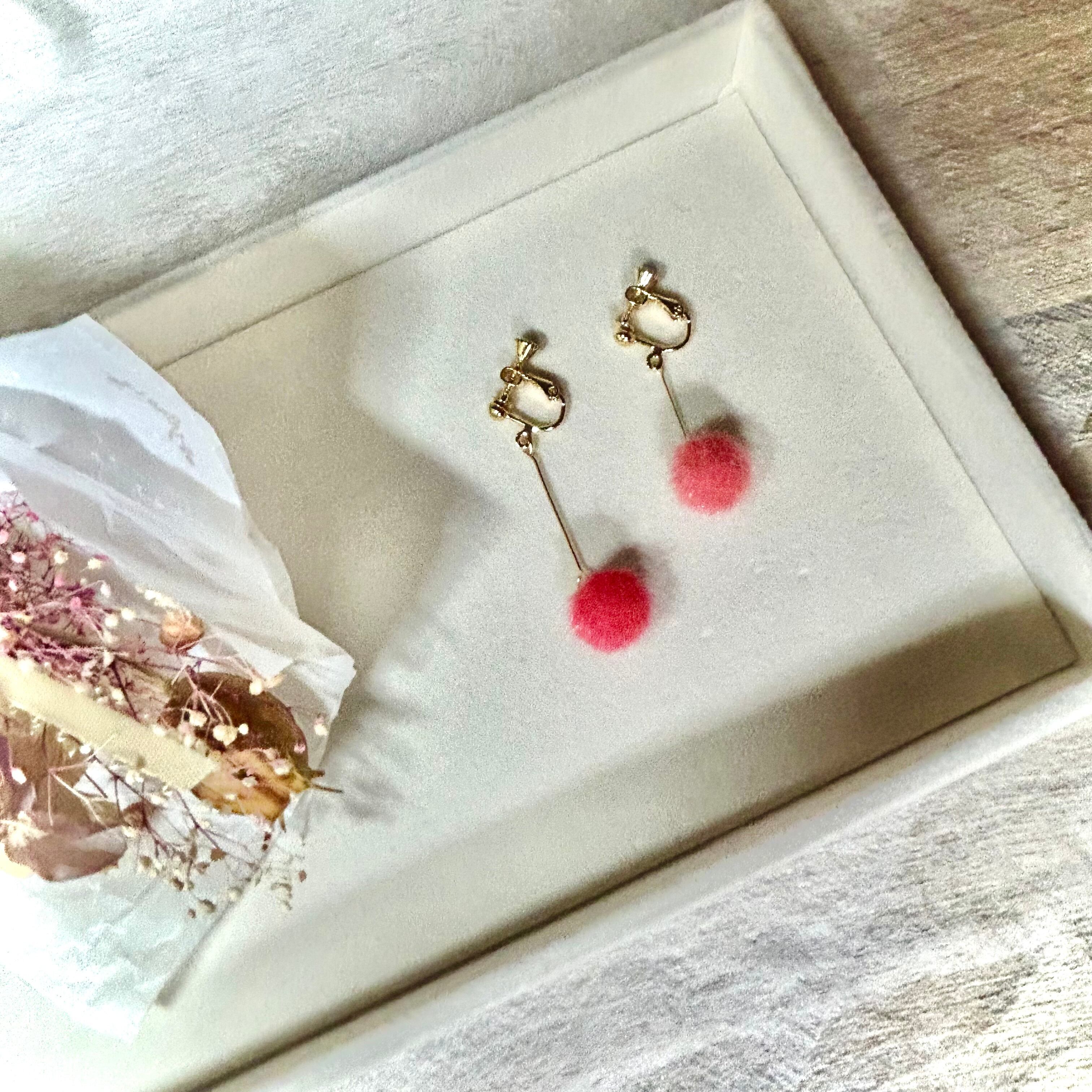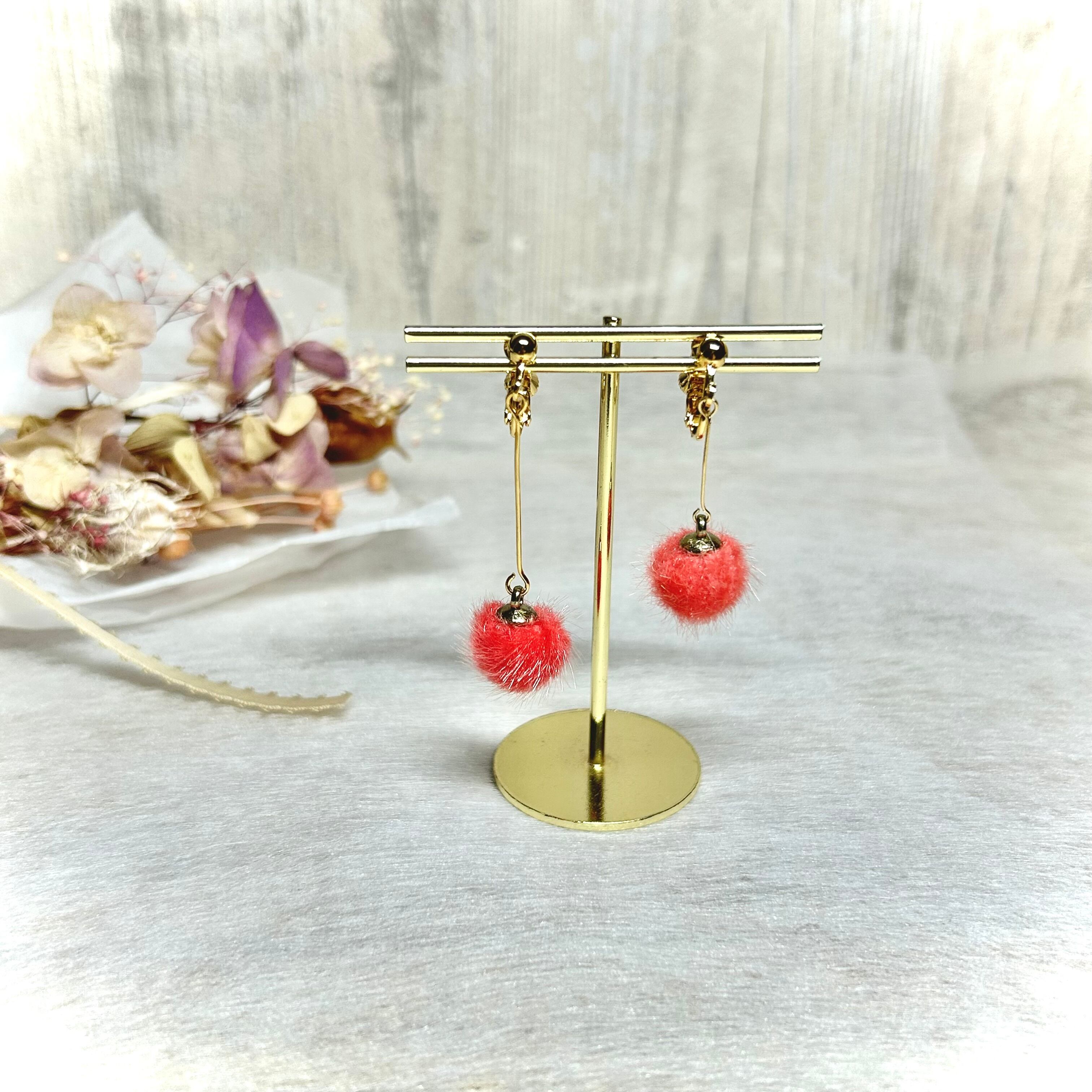 シンプルでどんなスタイルにも合わせやすいデザインで、可愛らしくおしゃれな印象を与え、ピアスの片方はピーチ、もう片方はライトピーチのファーボールがぶら下がり、揺れるたびにちょっとした遊び心を感じさせてくれます。