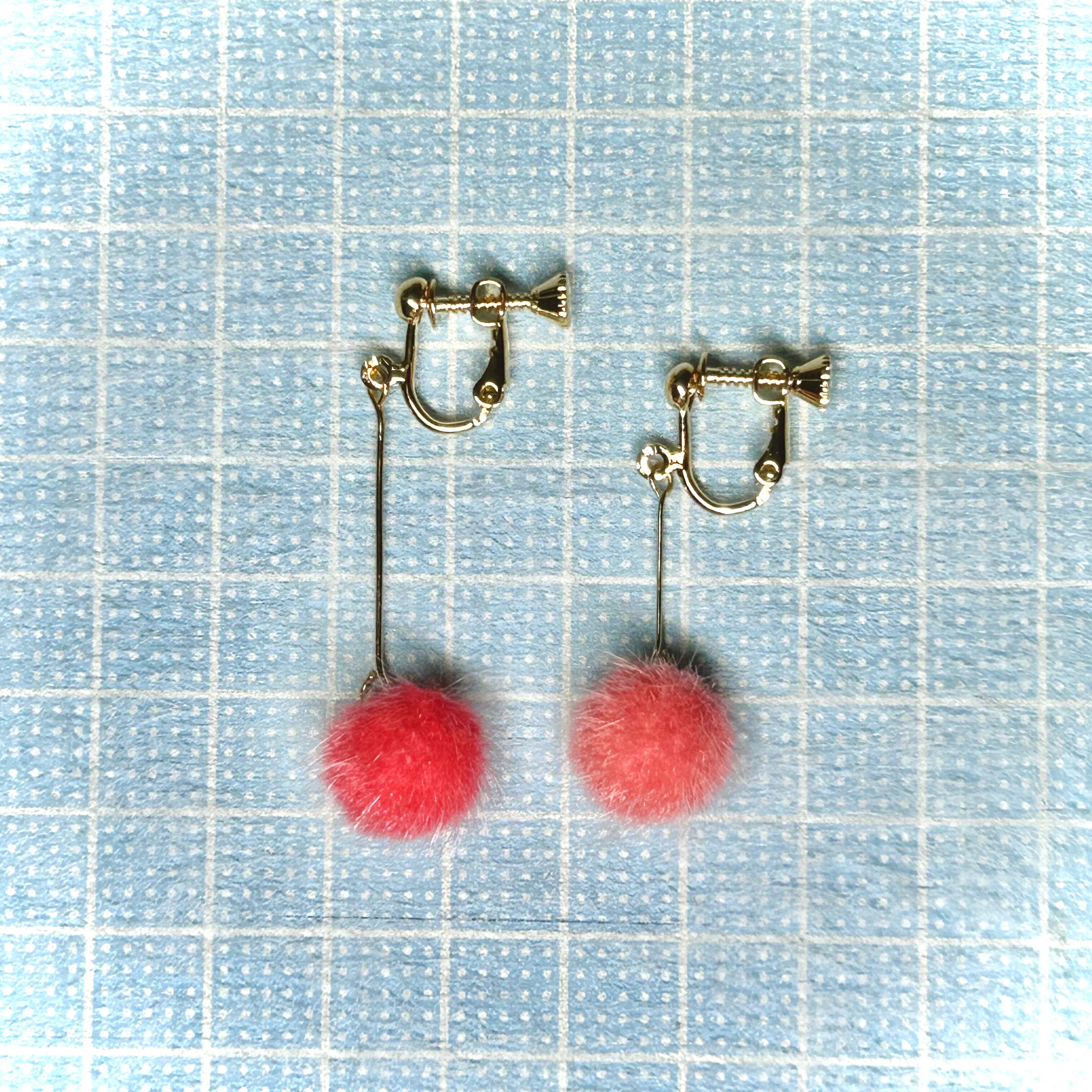 ピーチとライトピーチの繊細なファーボールがぶら下がり揺れる、アシンメトリーな可愛いピアスです。