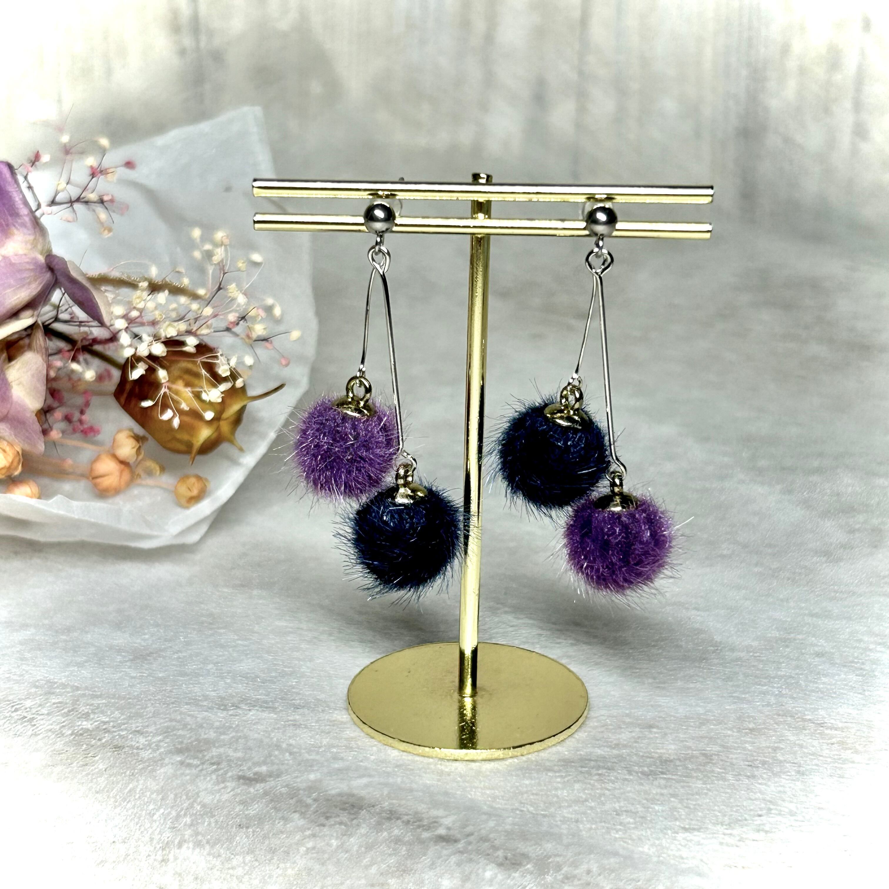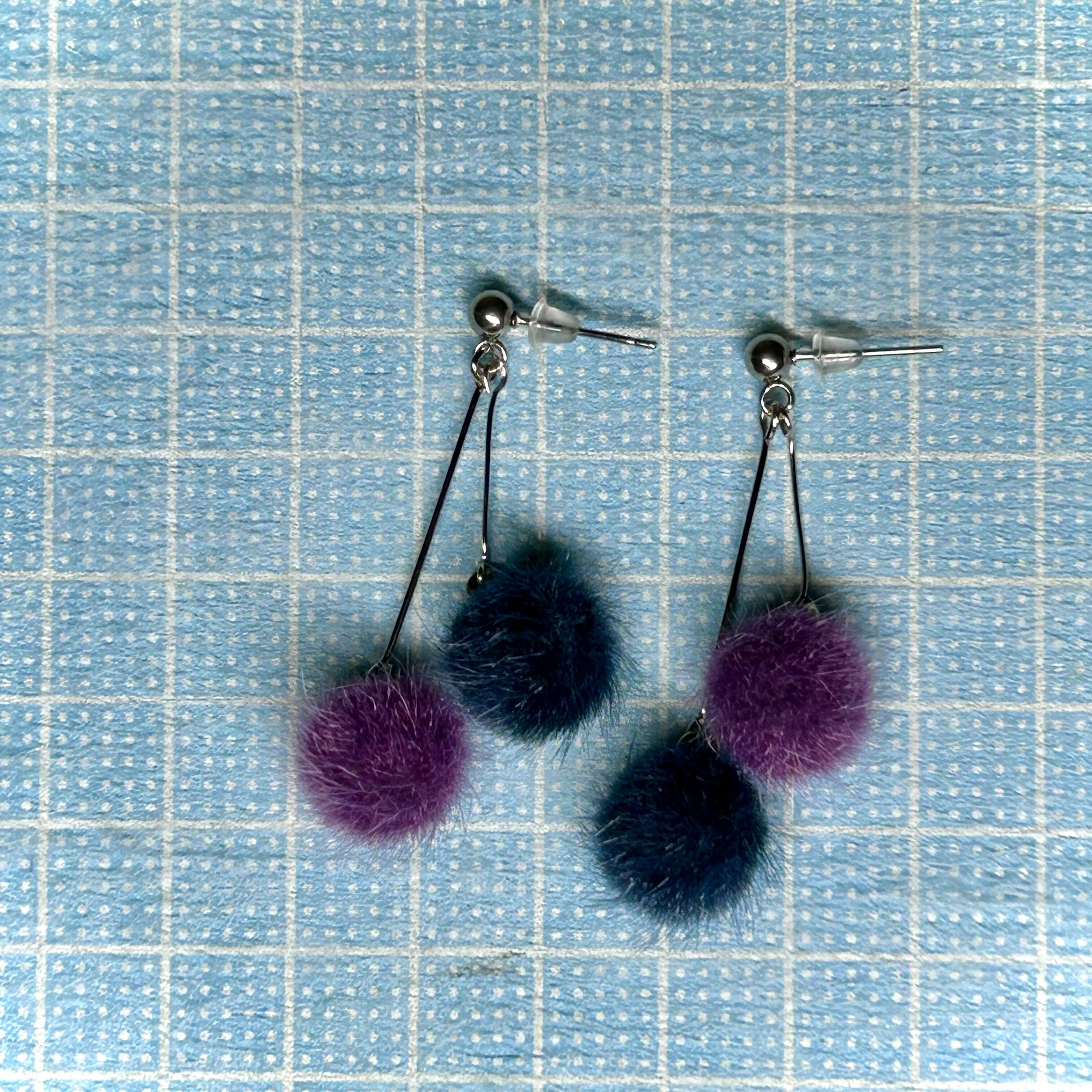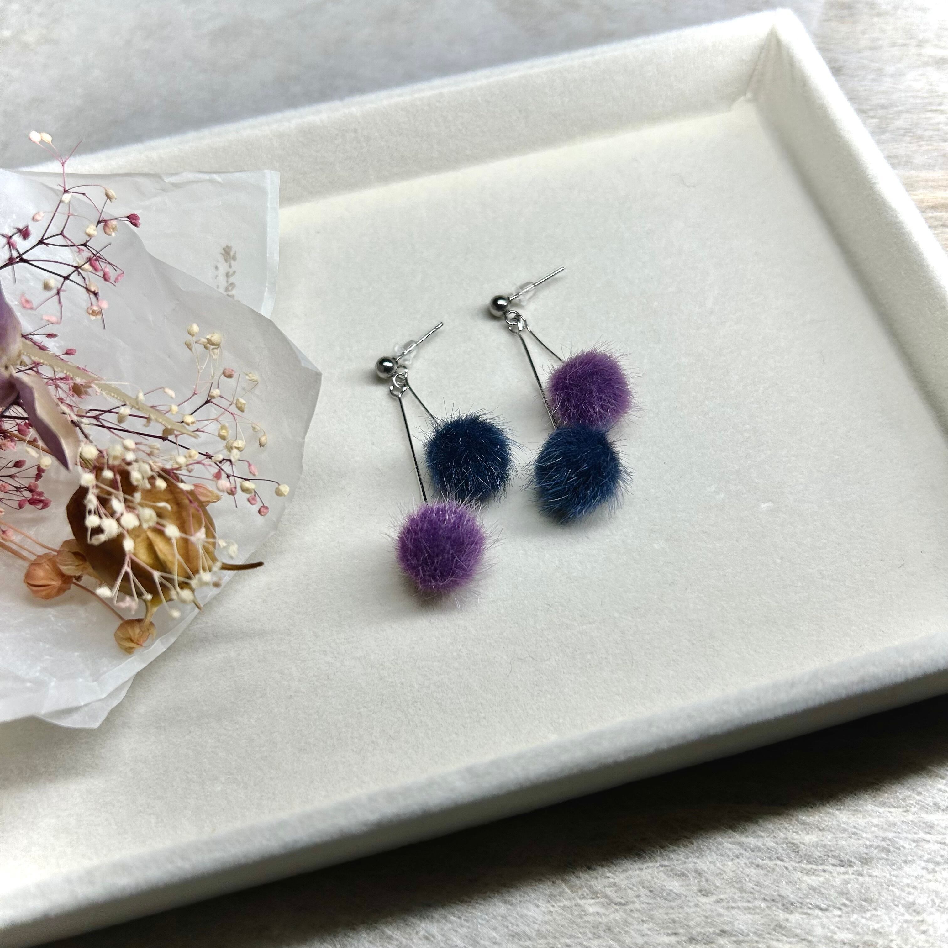 ネイビーとパープルの繊細なファーボールがぶら下がり揺れる、さくらんぼのような可愛いピアスです。