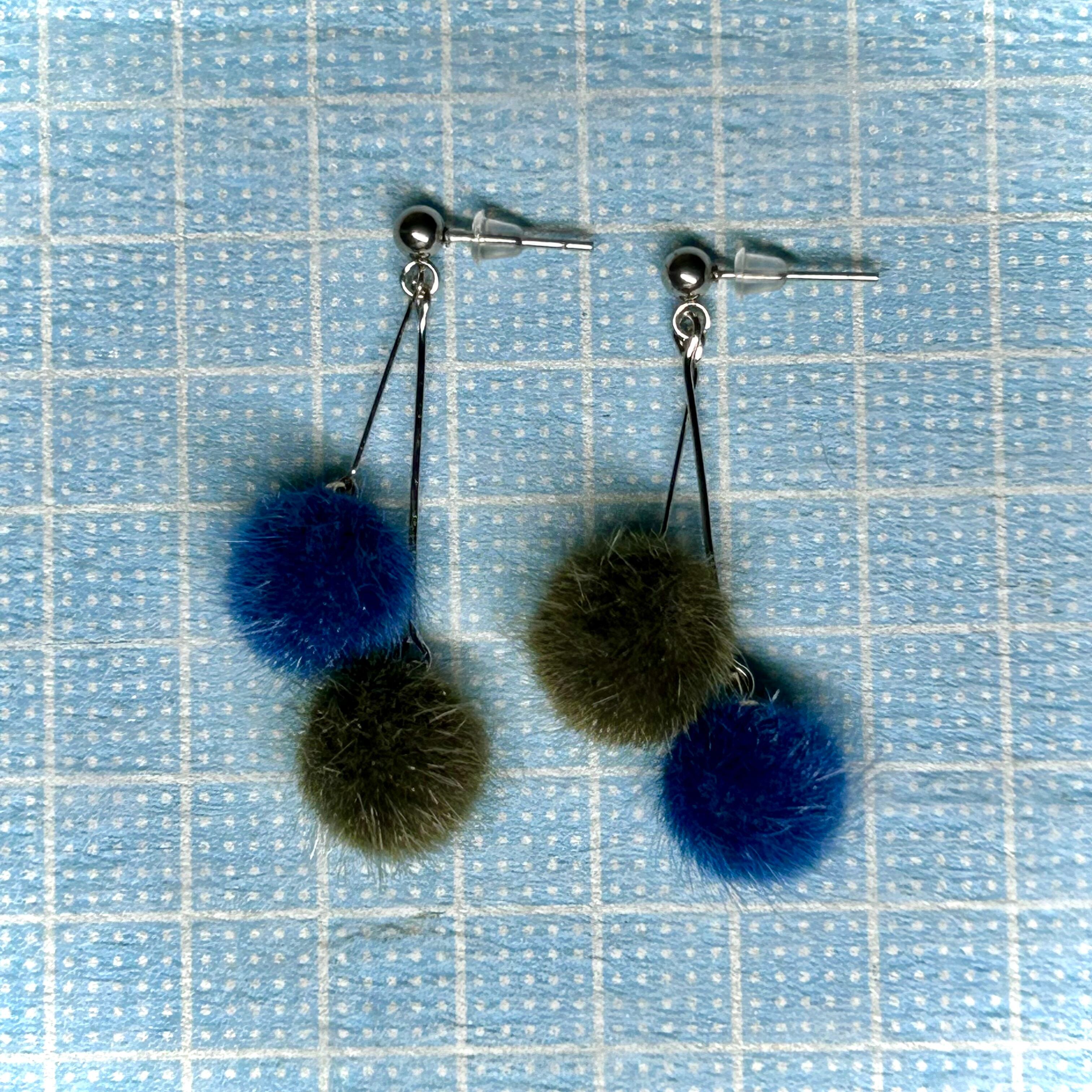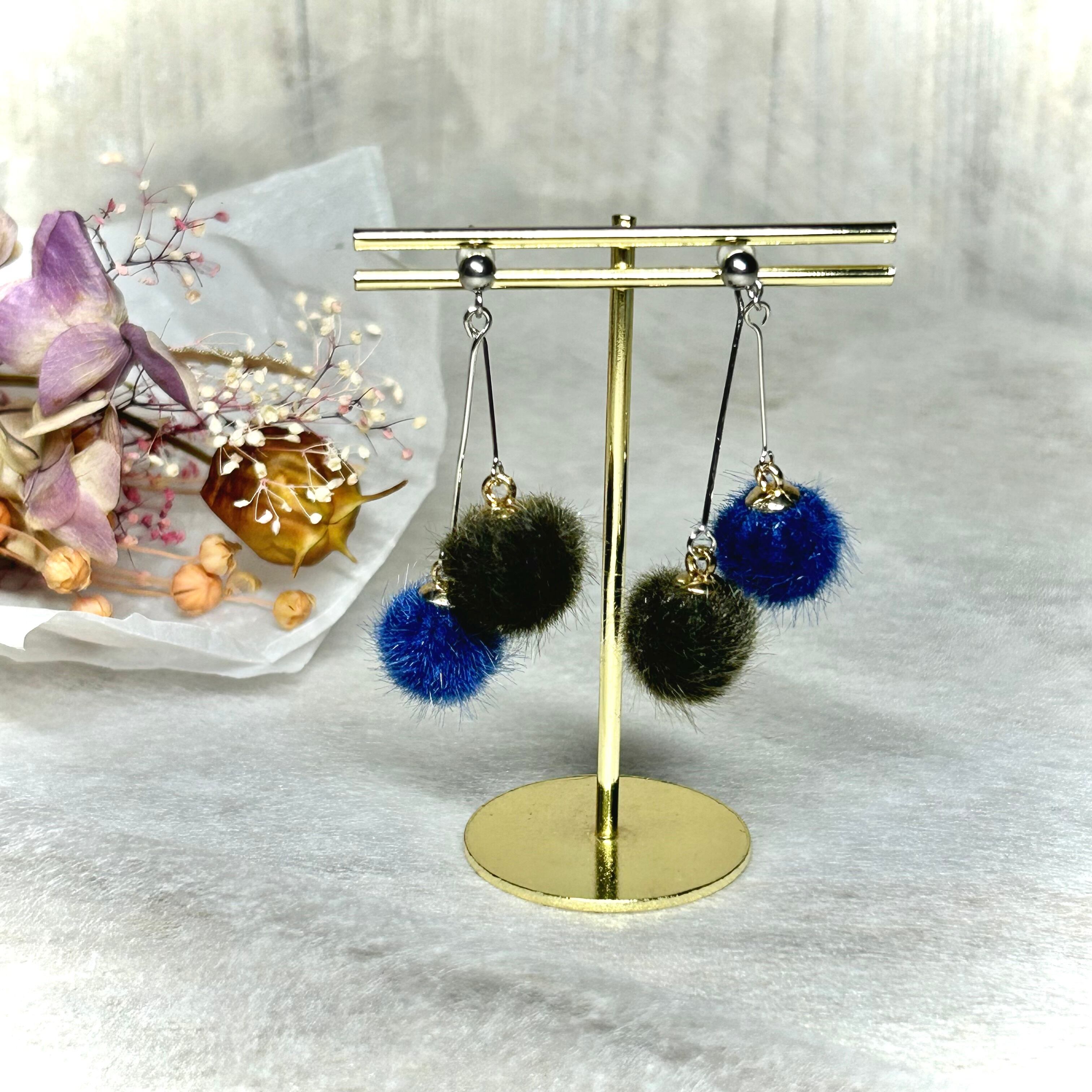 ネイビーとモスグリーンの繊細なファーボールがぶら下がり揺れる、さくらんぼのような可愛いピアスです。