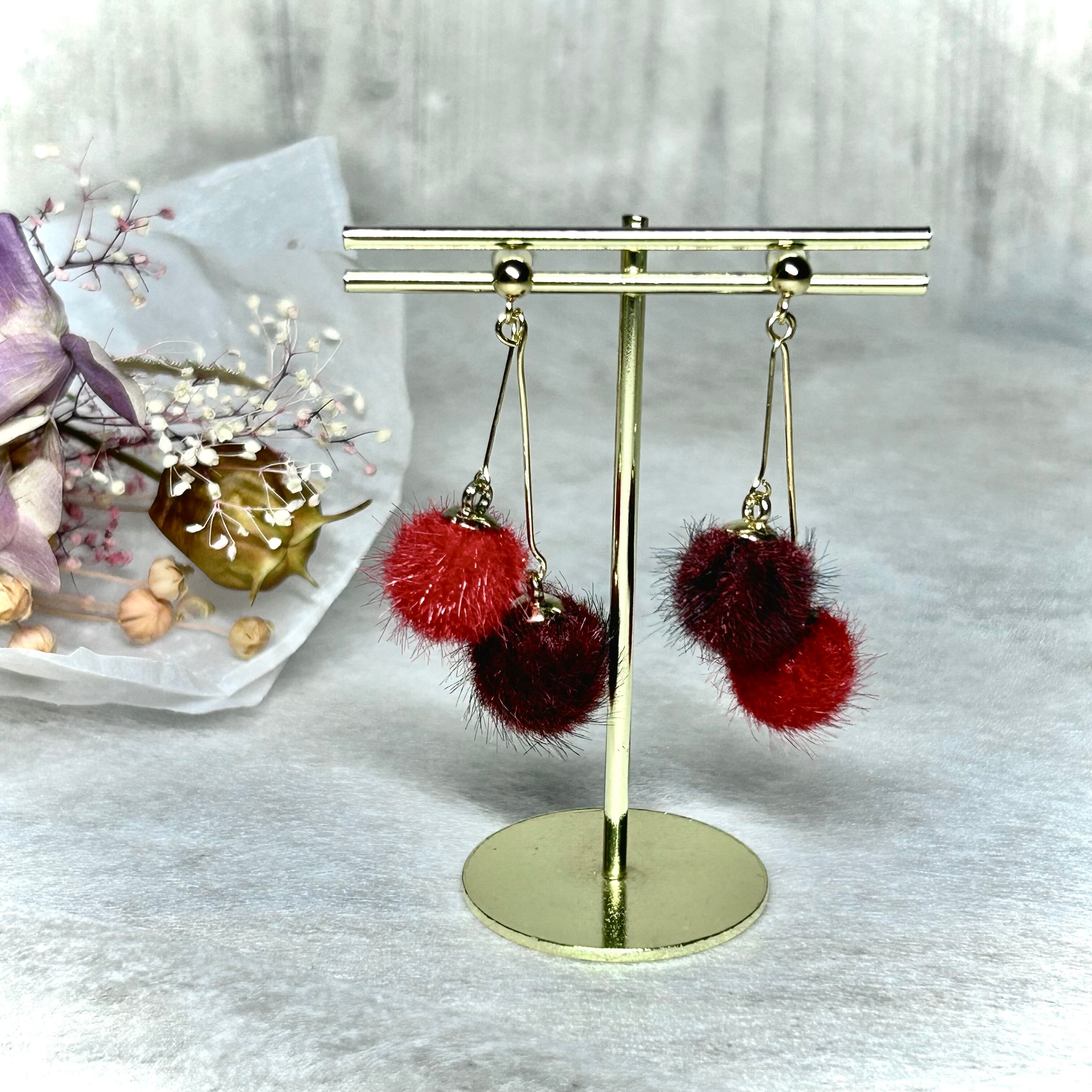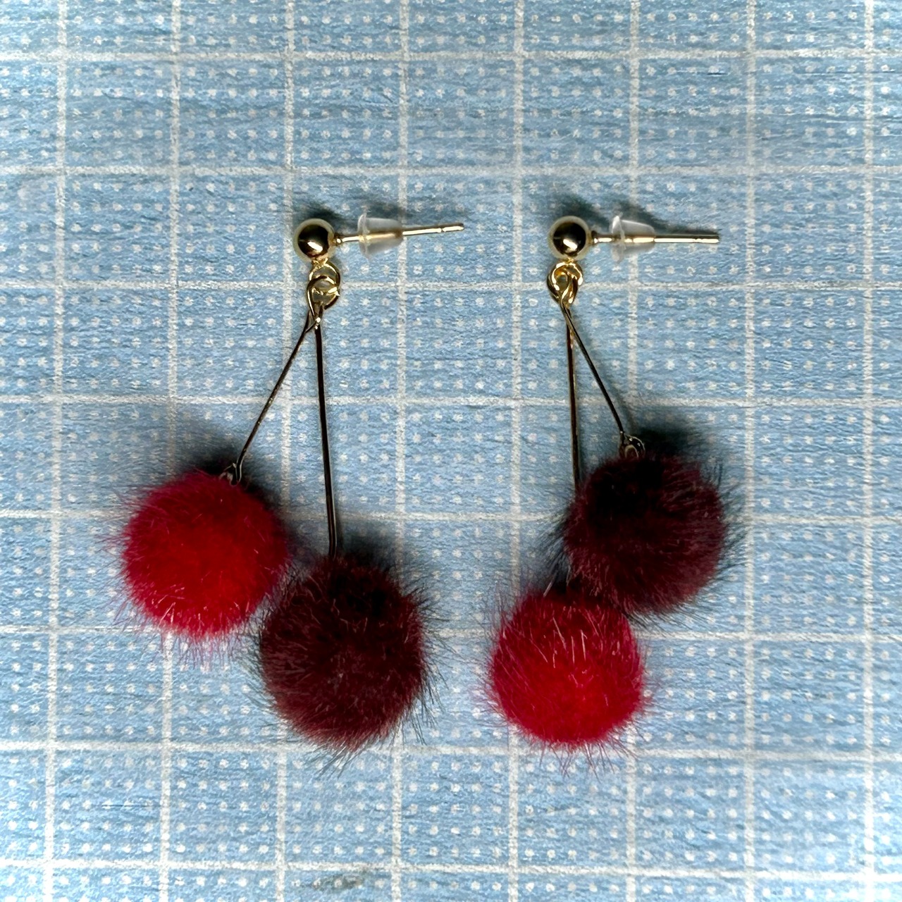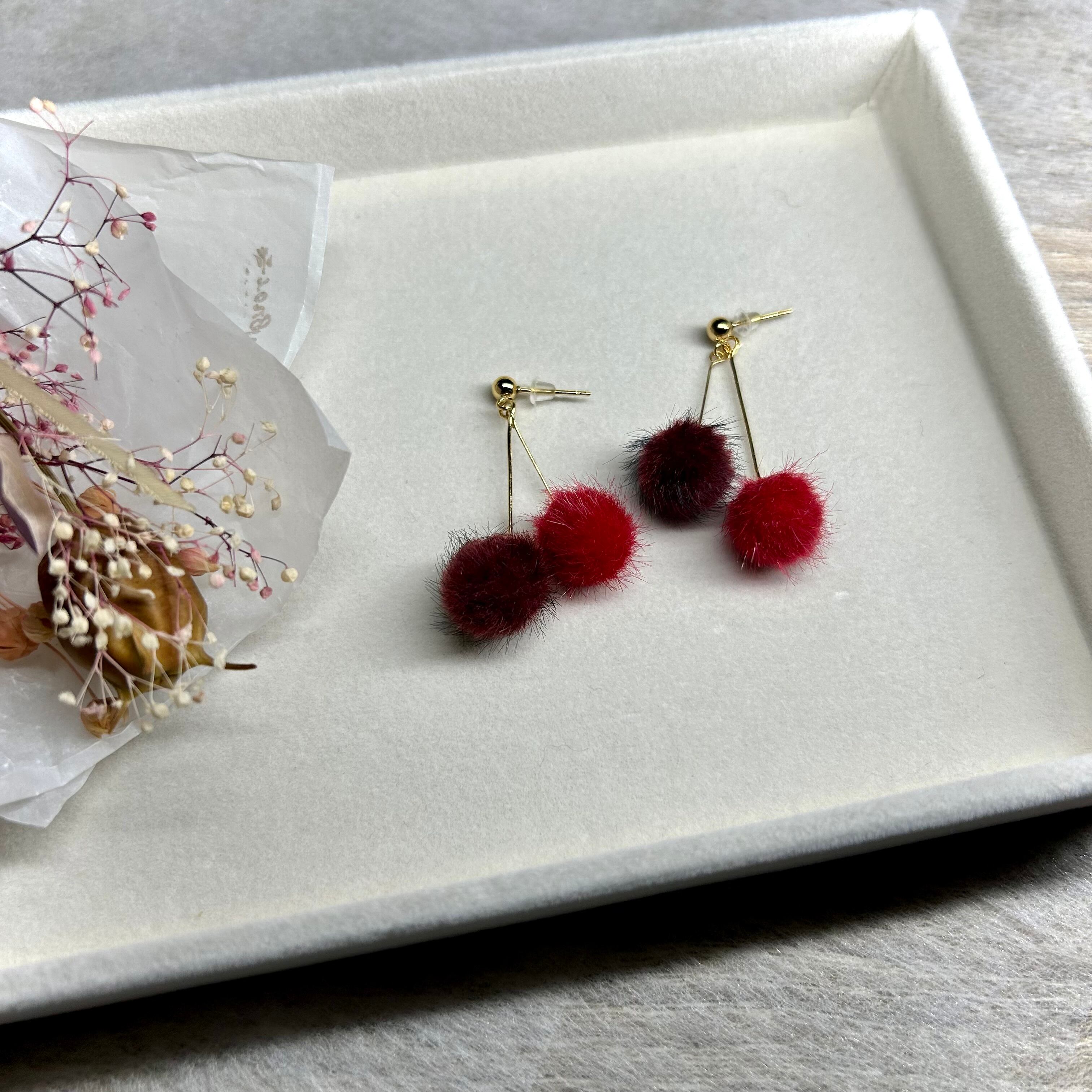 レッドとワインレッドの繊細なファーボールがぶら下がり揺れる、さくらんぼのような可愛いピアスです。