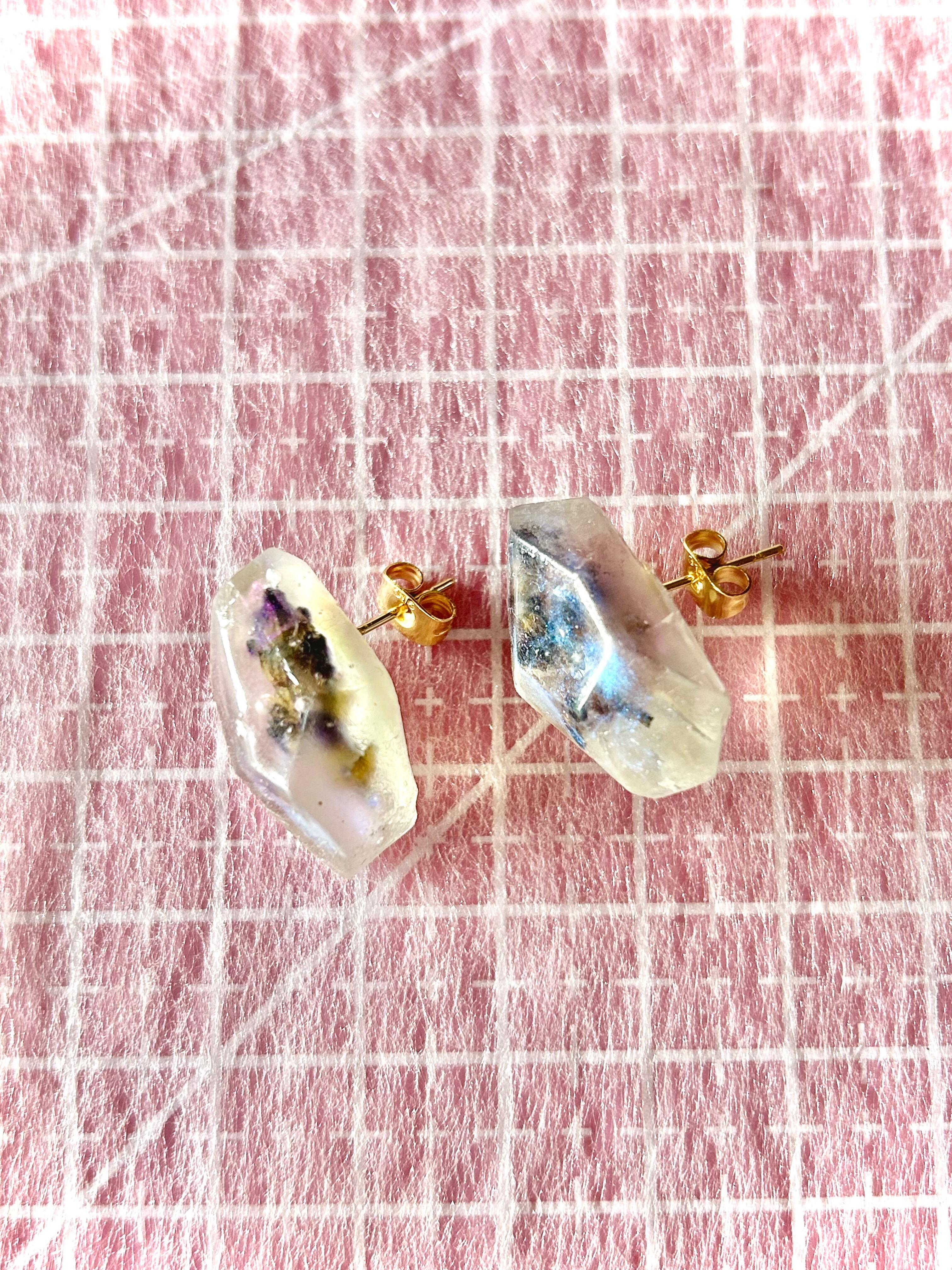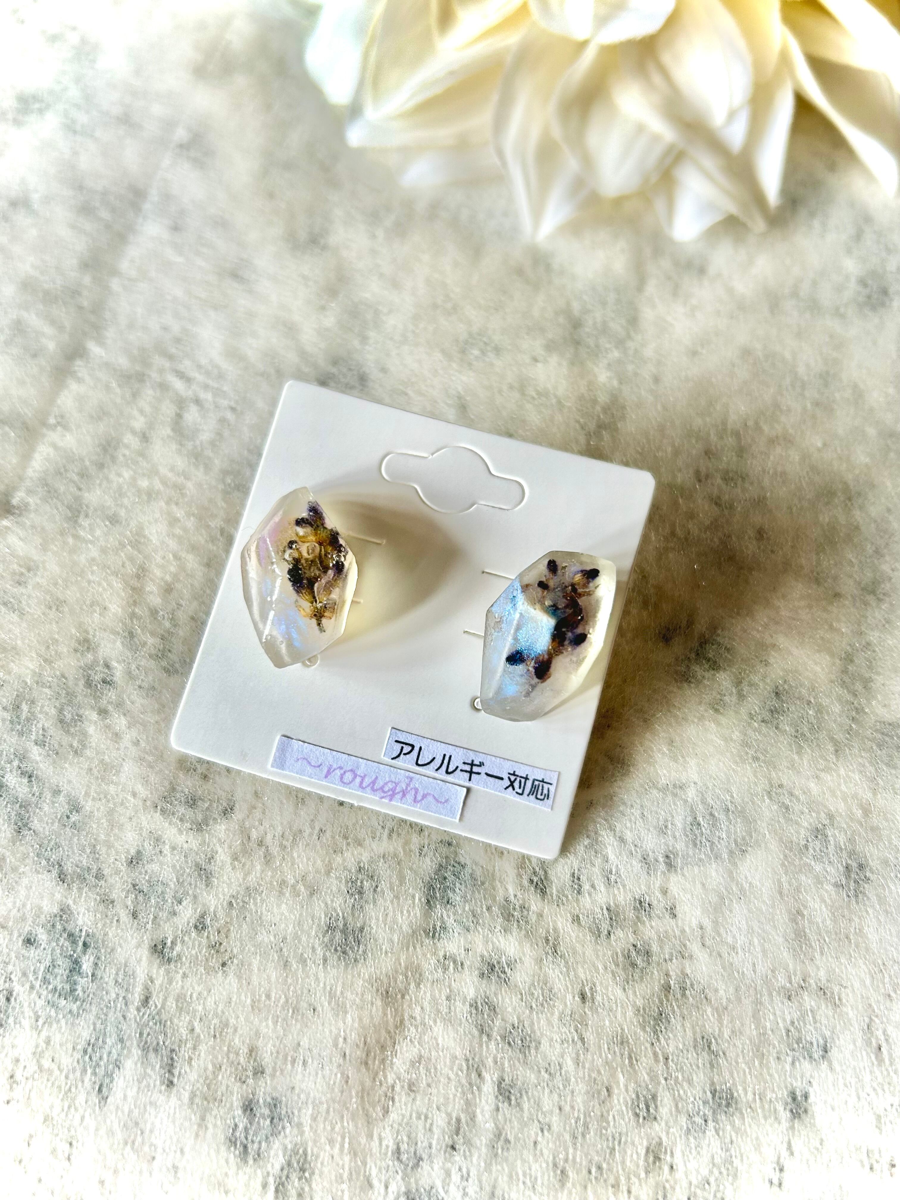 透明な鉱石に幻想的なオーロラとラベンダーの花が閉じ込められたピアス。