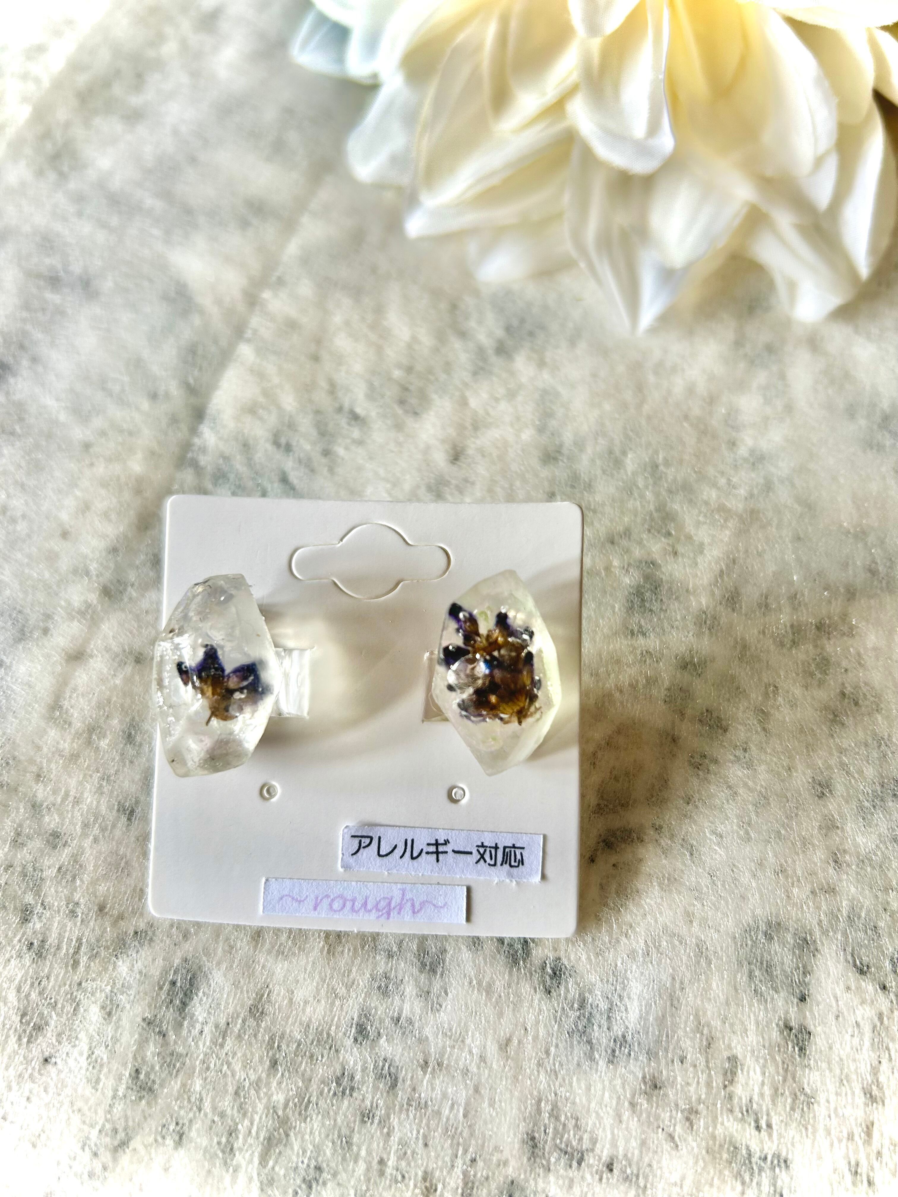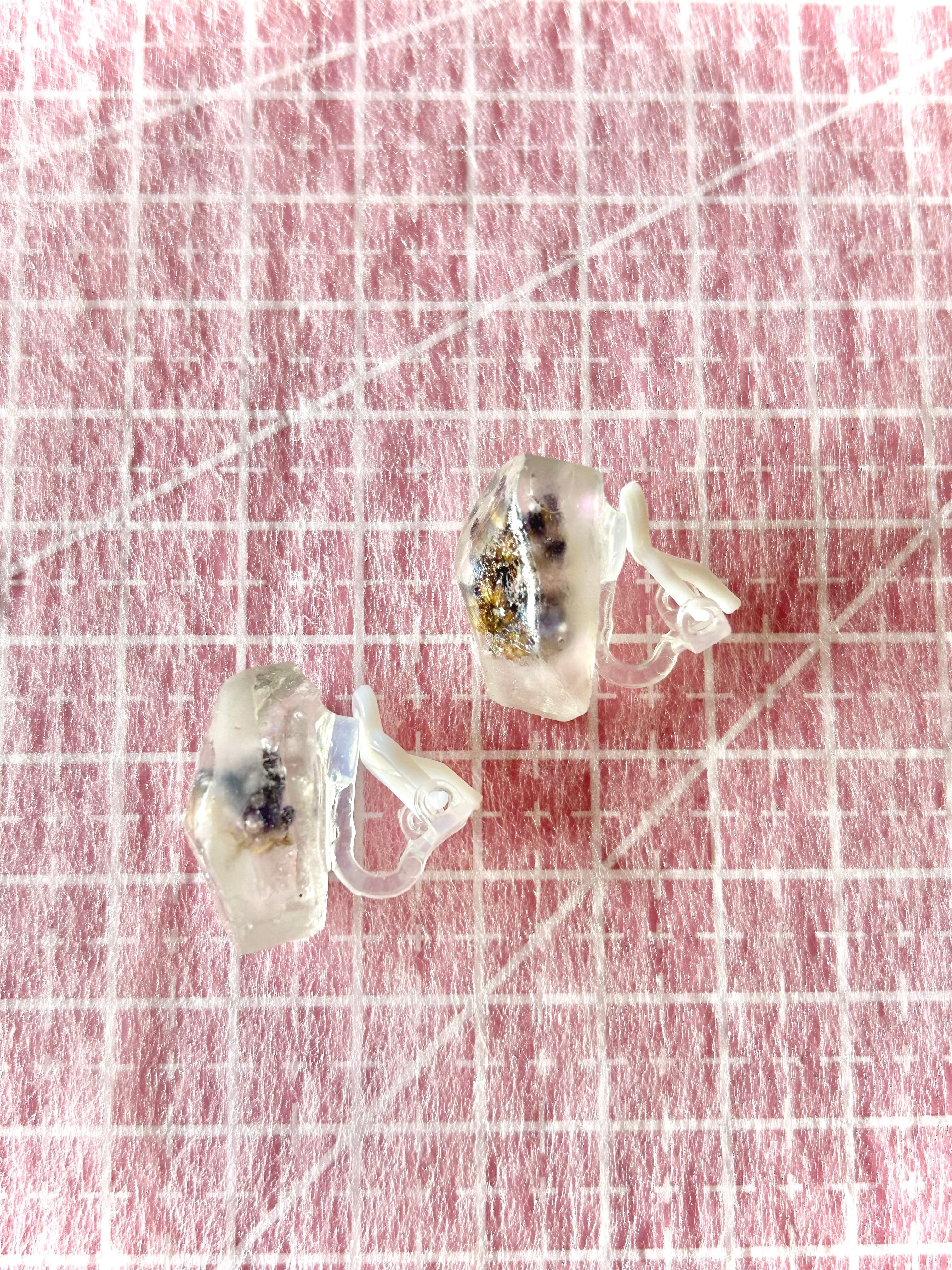 透明な鉱石に幻想的なオーロラとラベンダーの花が閉じ込められたイヤリング。