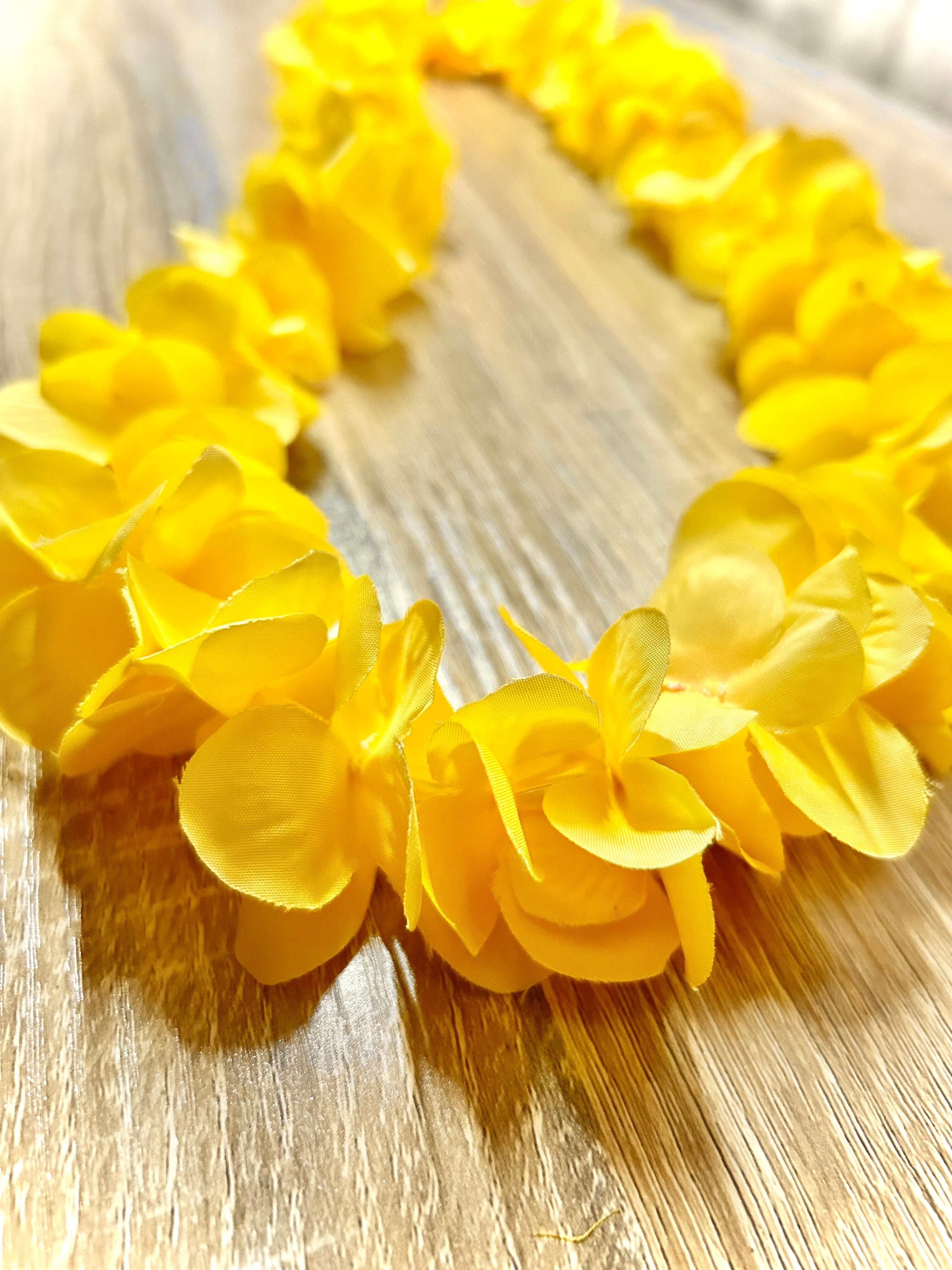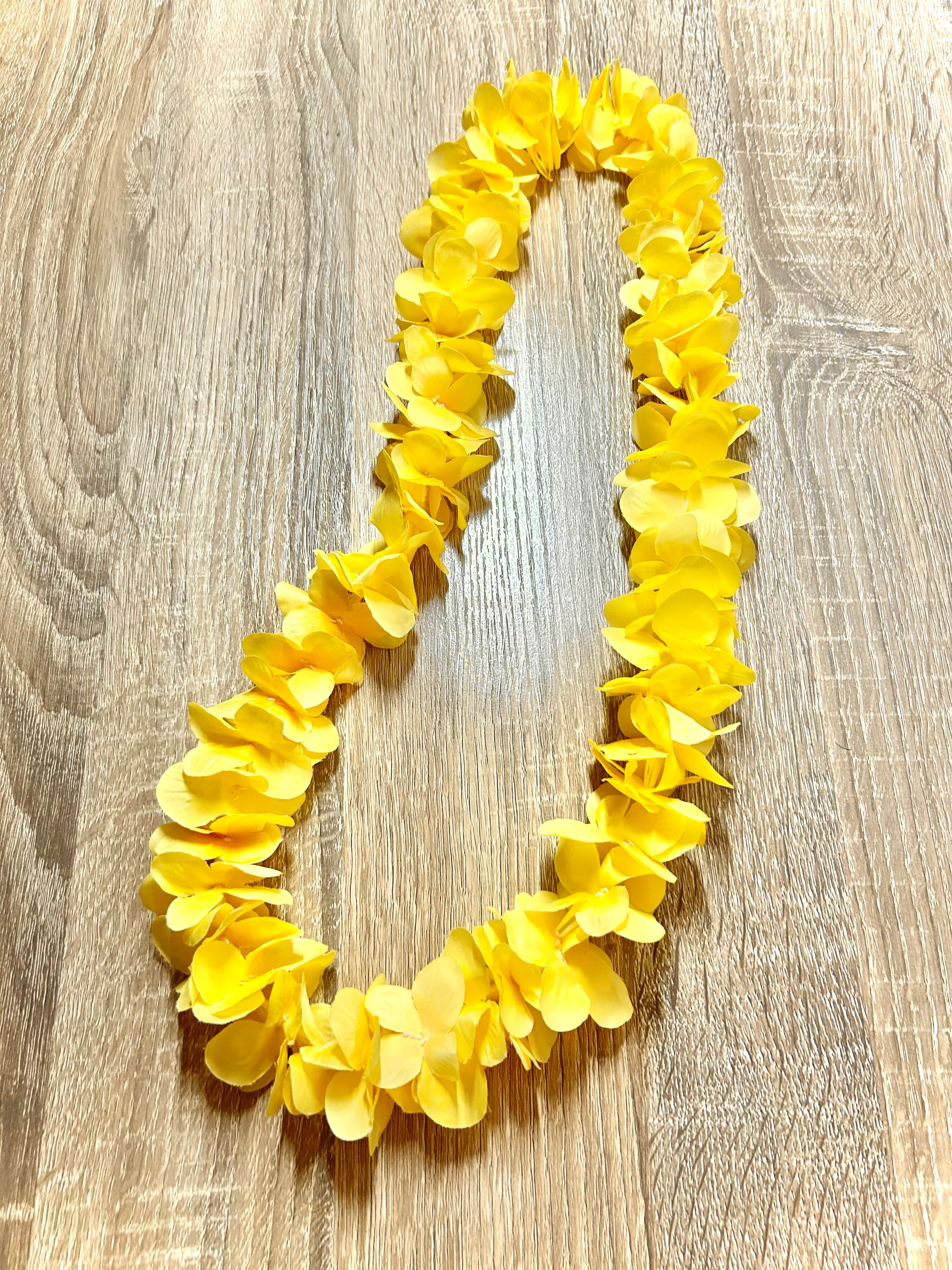 かわいい雰囲気のイエローの花とデザインビーズが美しく連なるレイです。
